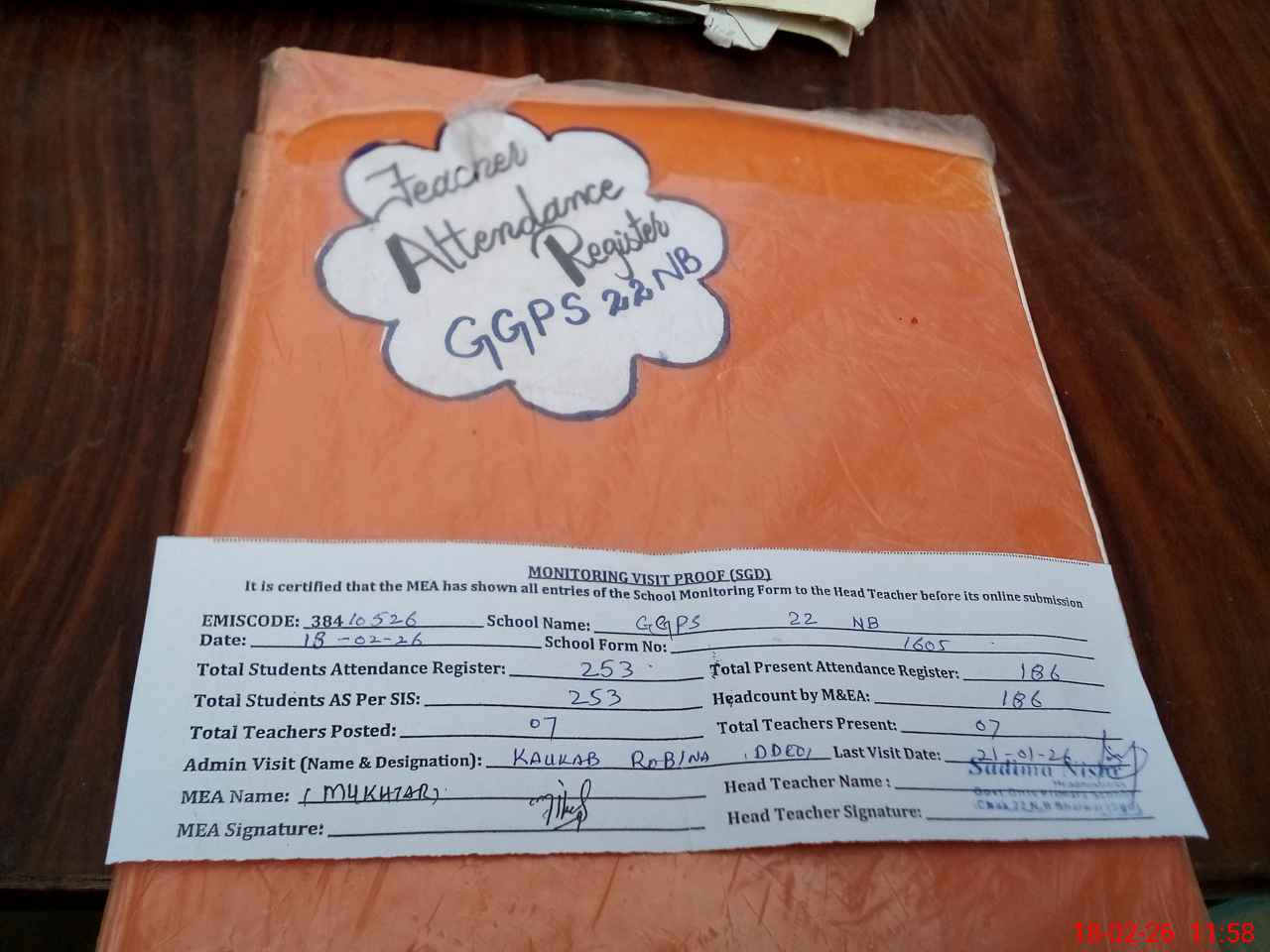 | Attendance Register | Head Teacher | MEA with School | Visit Proof |