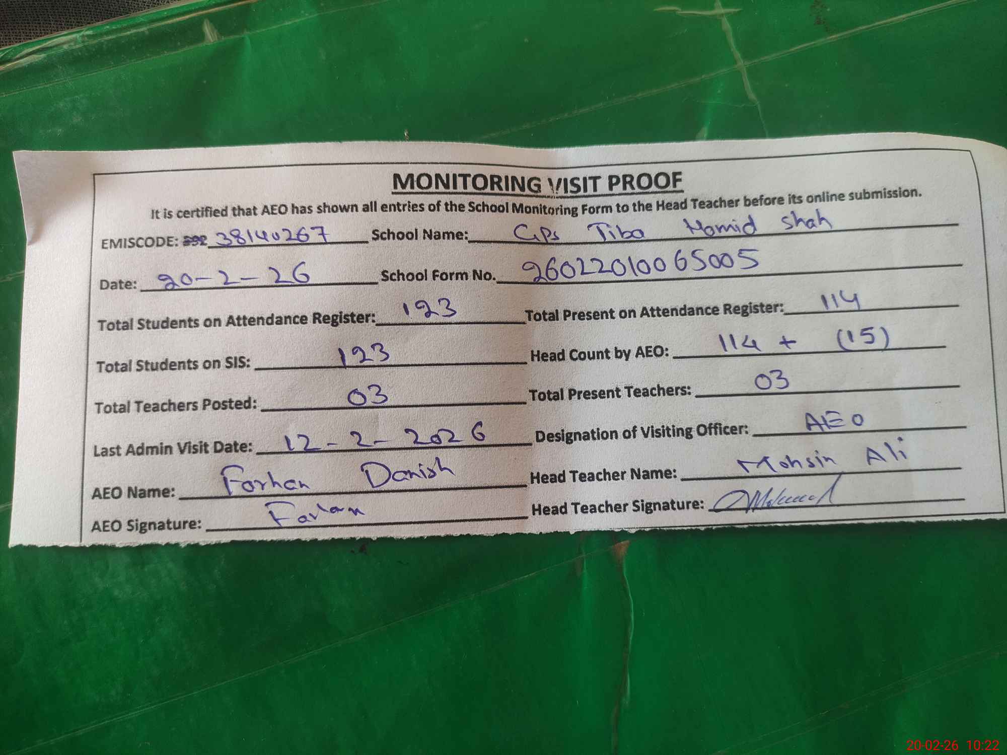 | Attendance Register | Head Teacher | MEA with School | Visit Proof |