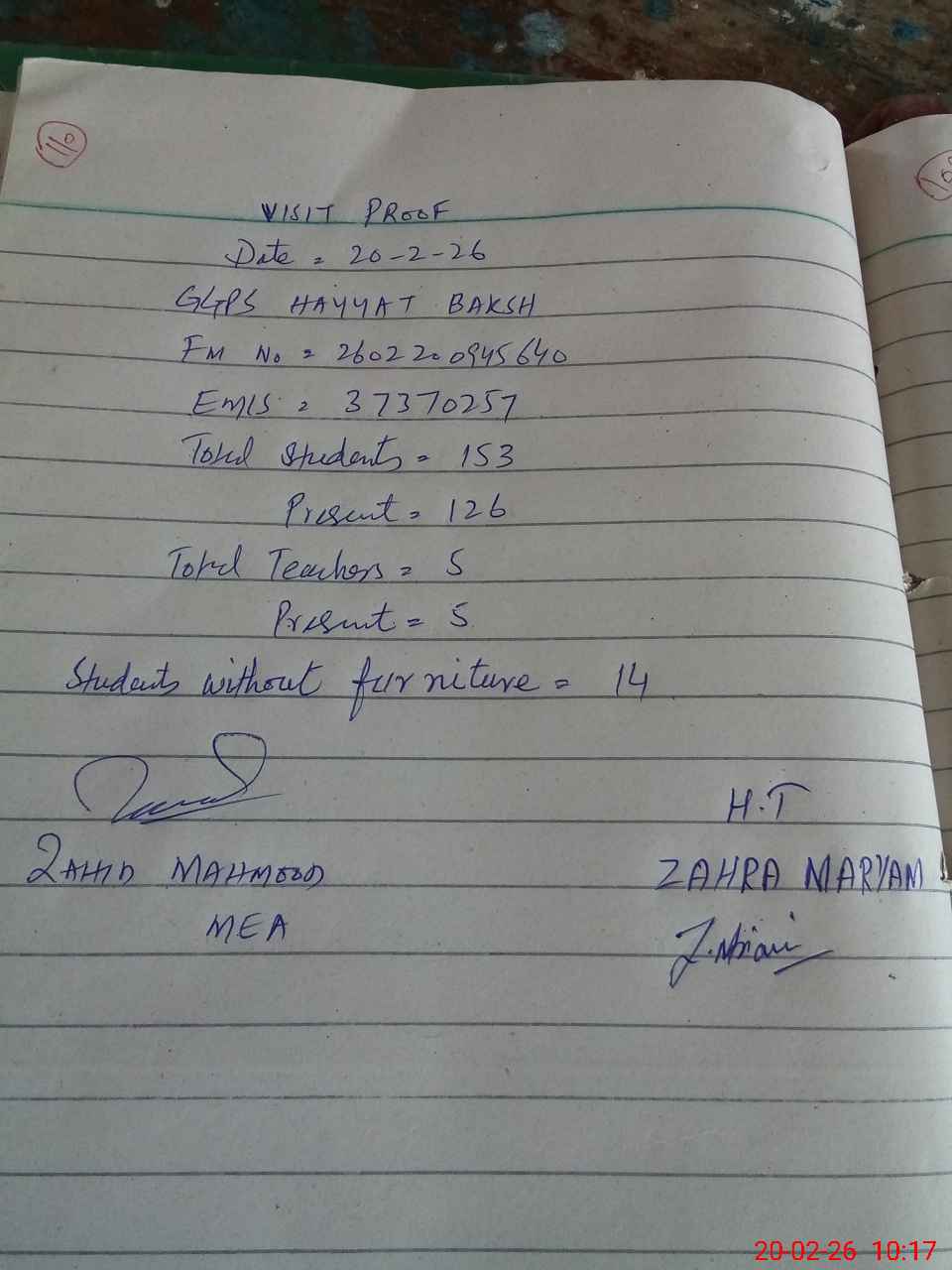 | Attendance Register | Head Teacher | MEA with School | Visit Proof |