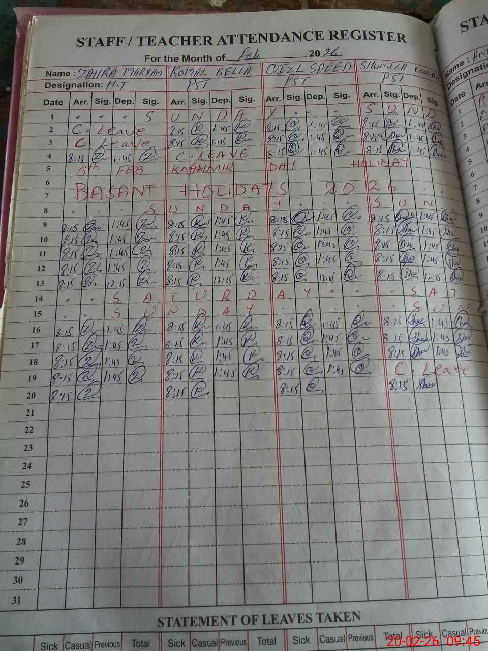 | Leave | Duty | Absent | Maternity | Medical | Ex- Pak |