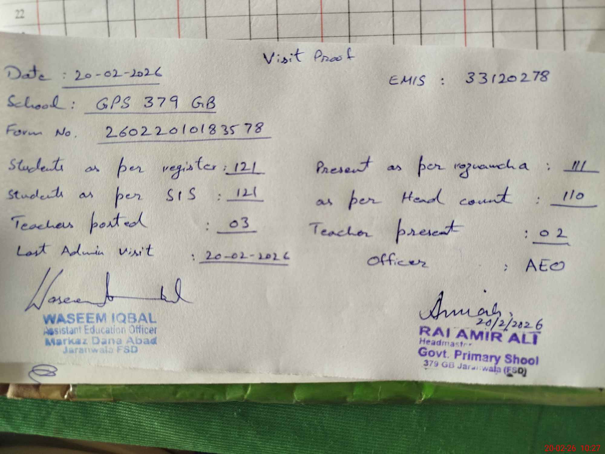 | EMIS Code: 33120278 | Name of School: GPS 379 GB | |||