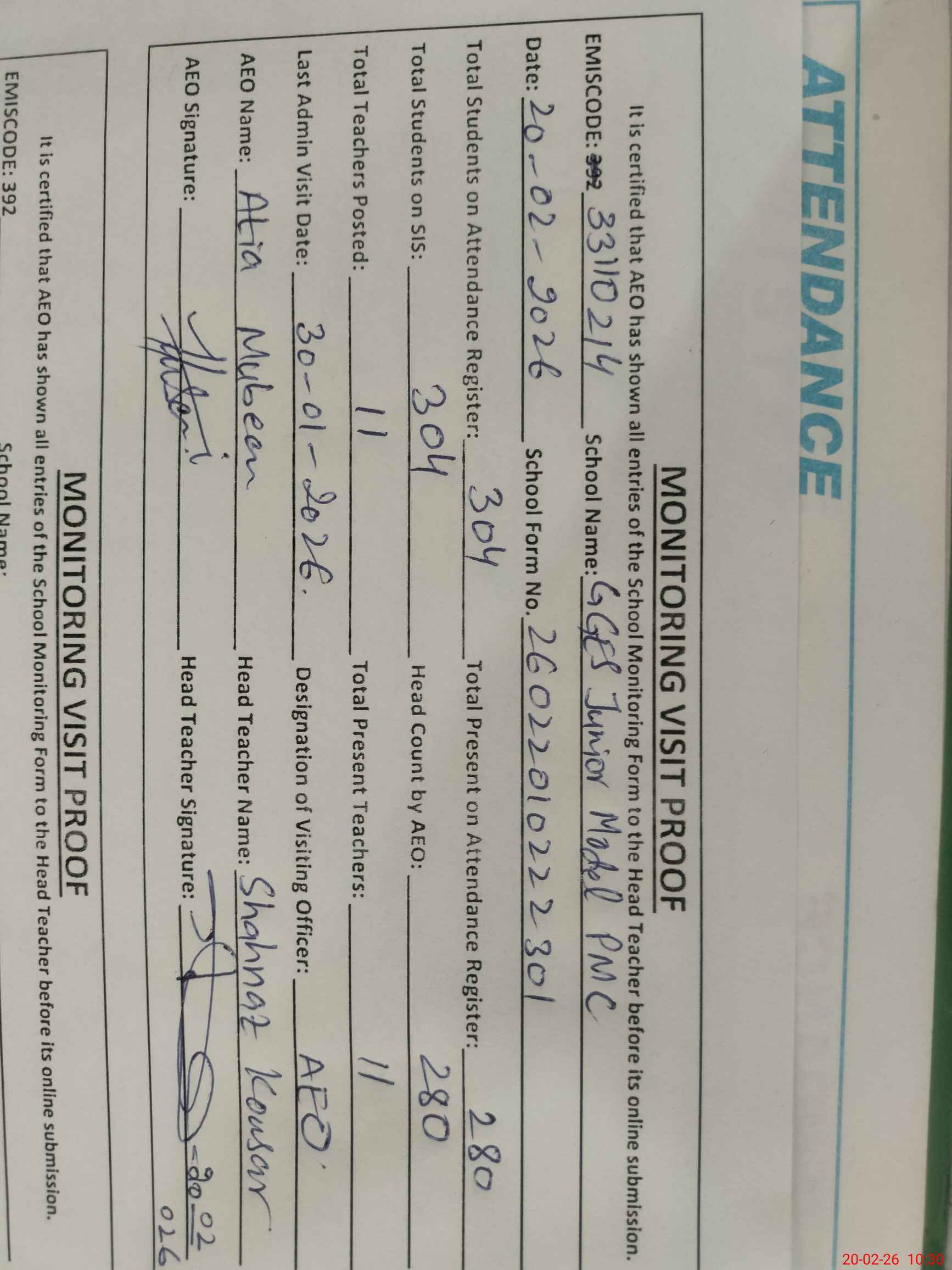 | Attendance Register | Head Teacher | MEA with School | Visit Proof |