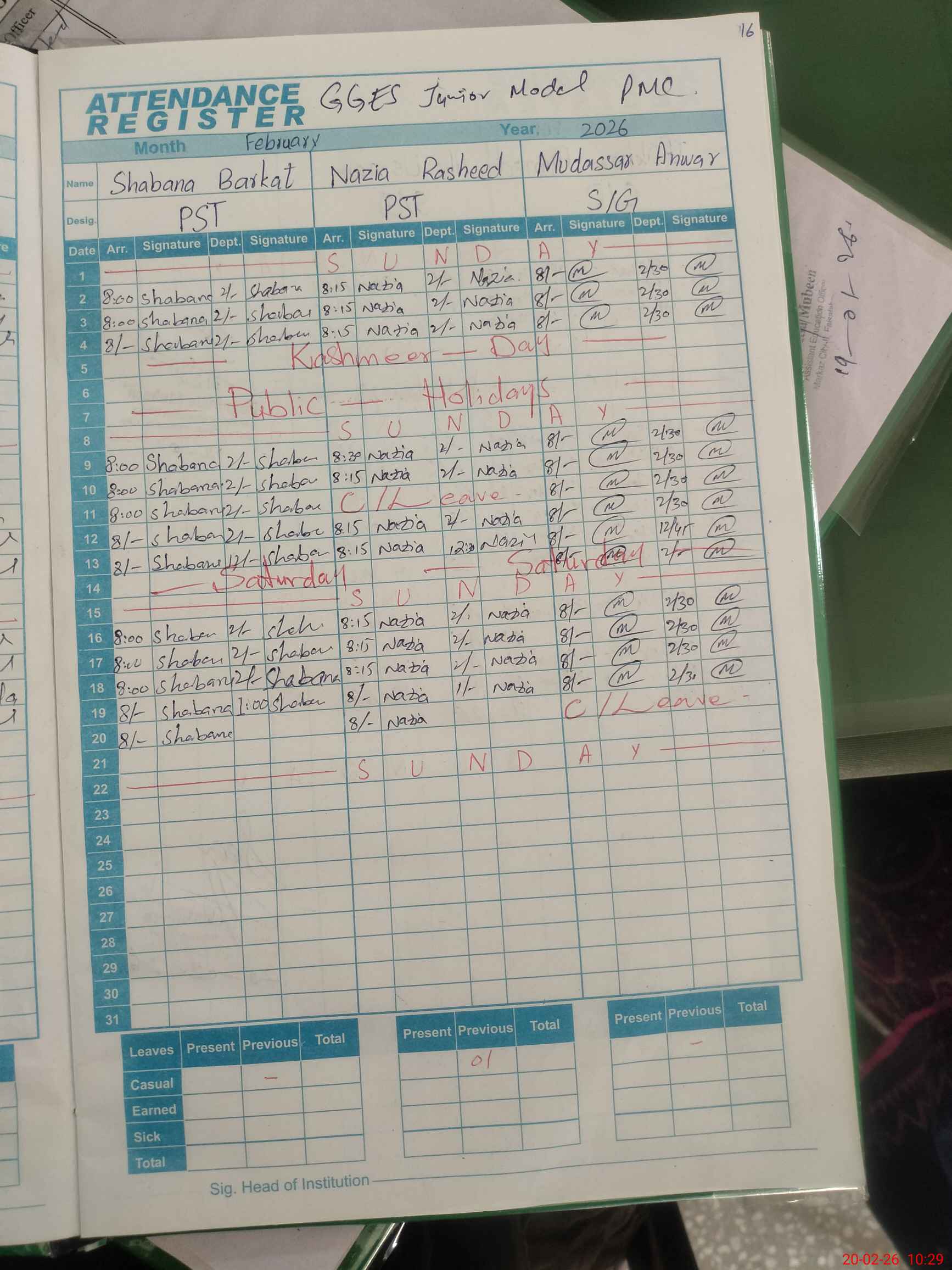 | CNIC | Full Name | Designation | R/C | Absence During Last Calender Month |