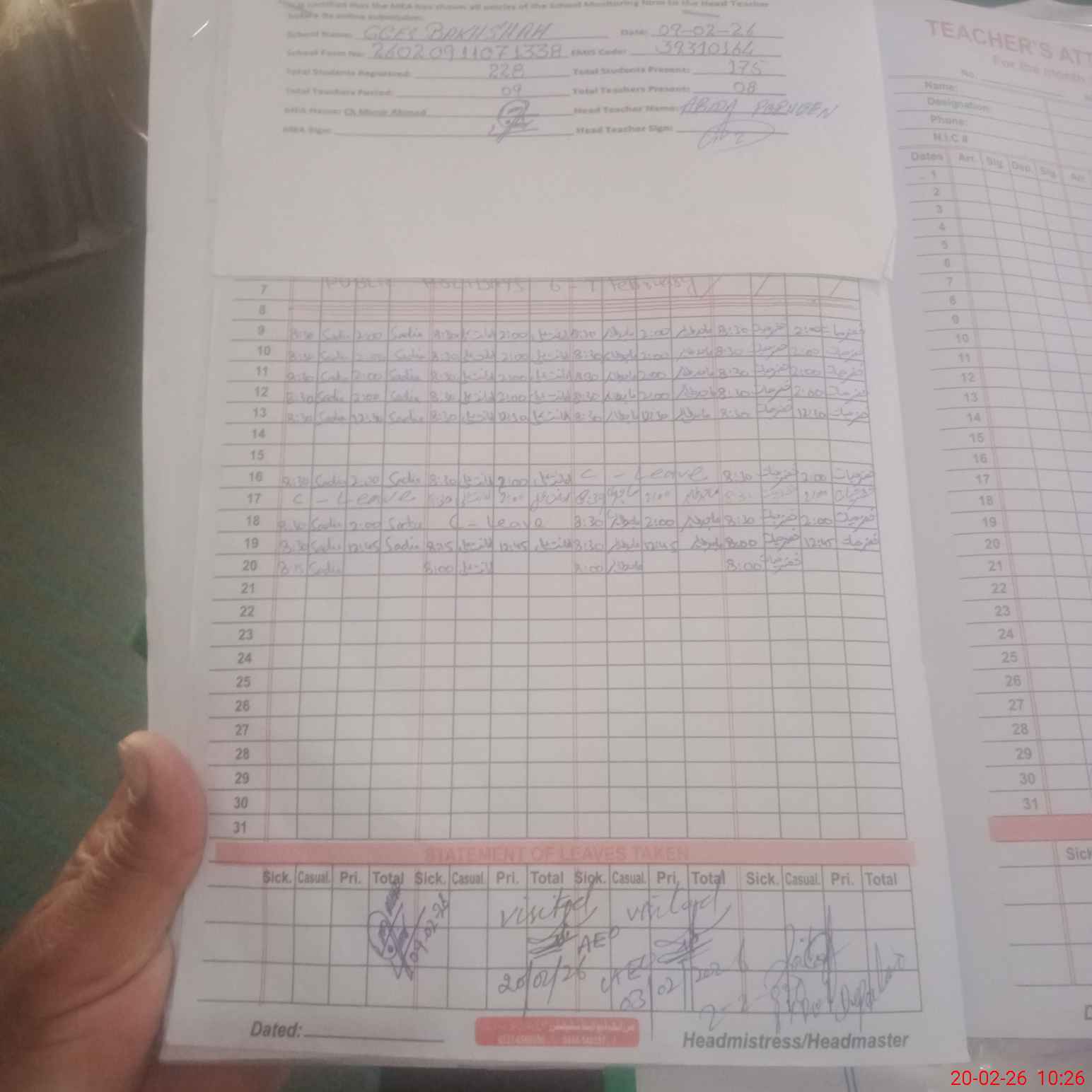 | Attendance Register | Head Teacher | MEA with School | Visit Proof |