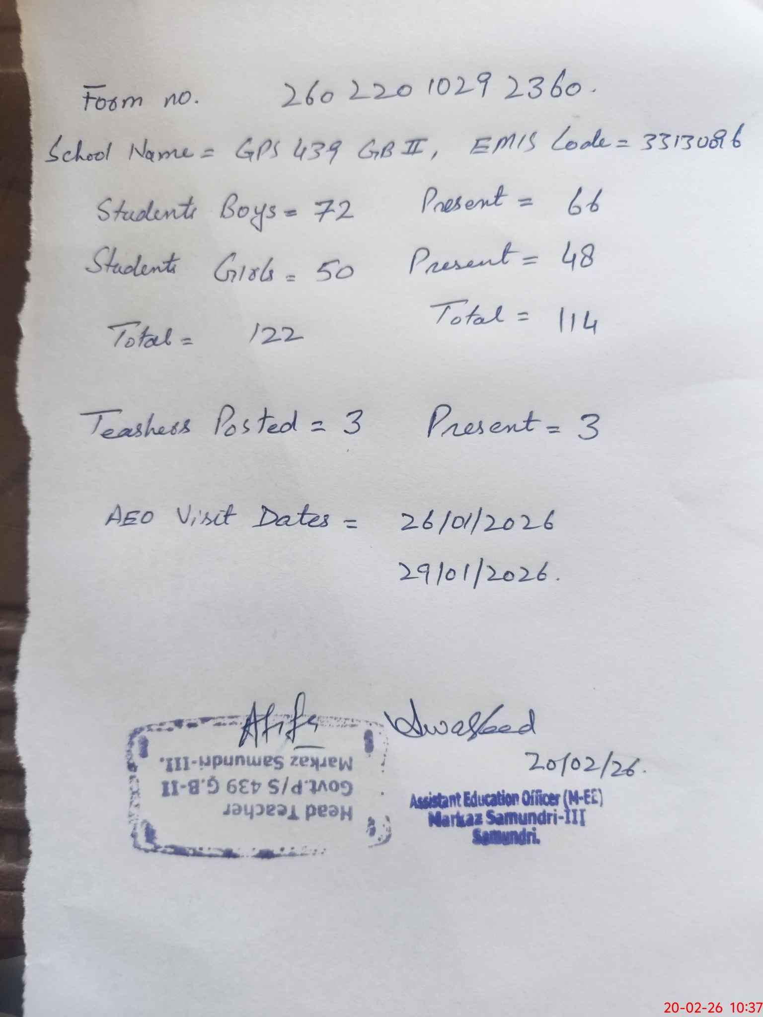 | EMIS Code: 33130096 | Name of School: GPS CHAK 439 GB II SAMUNDRI | |||