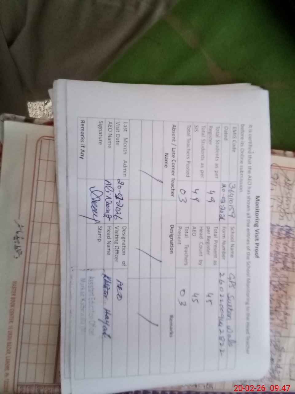 | Attendance Register | Head Teacher | MEA with School | Visit Proof |