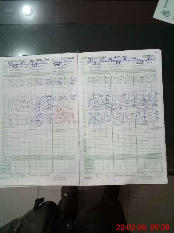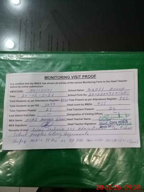 | Remarks (Use Separate Page if Required): Attendance of teaching staff and students on SIS Software is not updated Saima Shaheen SSS is performing her duty as Administrator The Time School Peoples Colony Gujranwala Shafaq Nazir SS Bio is transferred as Dy DEO WEE Gujranwala vide SO (SE-1) 1-5/2025 Following Teachers are on LPR Samina Maqbool EST Batool Qasim EST Data as per provided by School Staff and found during physical visit | |||||