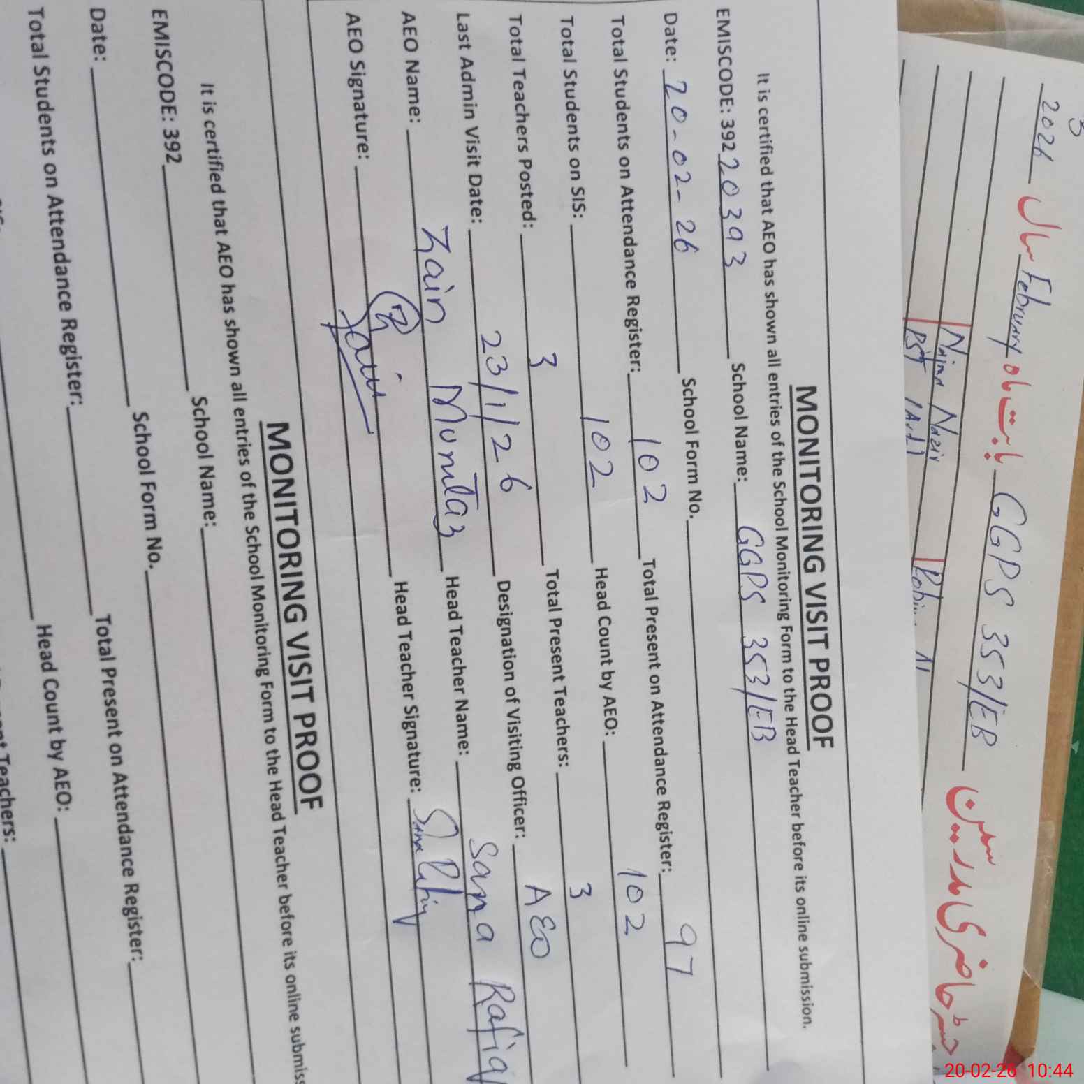 | Monitoring Date: 20-02-2026 | Start Time: 20-02-2026 10:16 AM | End Time: 20-02-2026 10:44 AM | Name of MEA: Za**** Mu**** | |