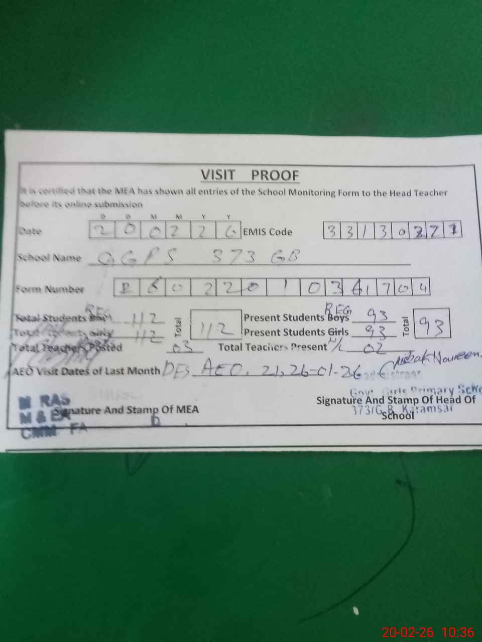 | Attendance Register | Head Teacher | MEA with School | Visit Proof |