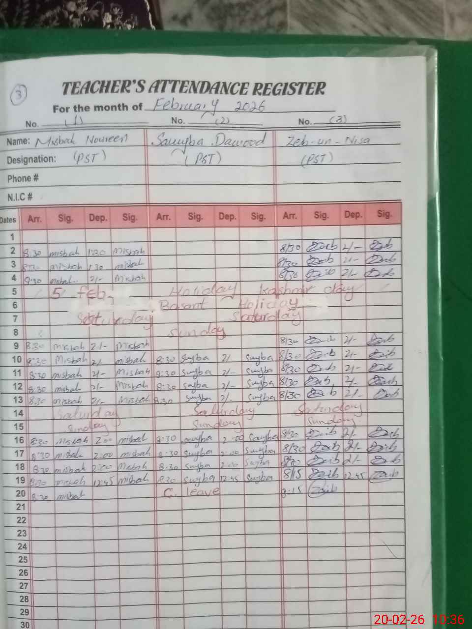 | CNIC | Full Name | Designation | R/C | Absence During Last Calender Month |