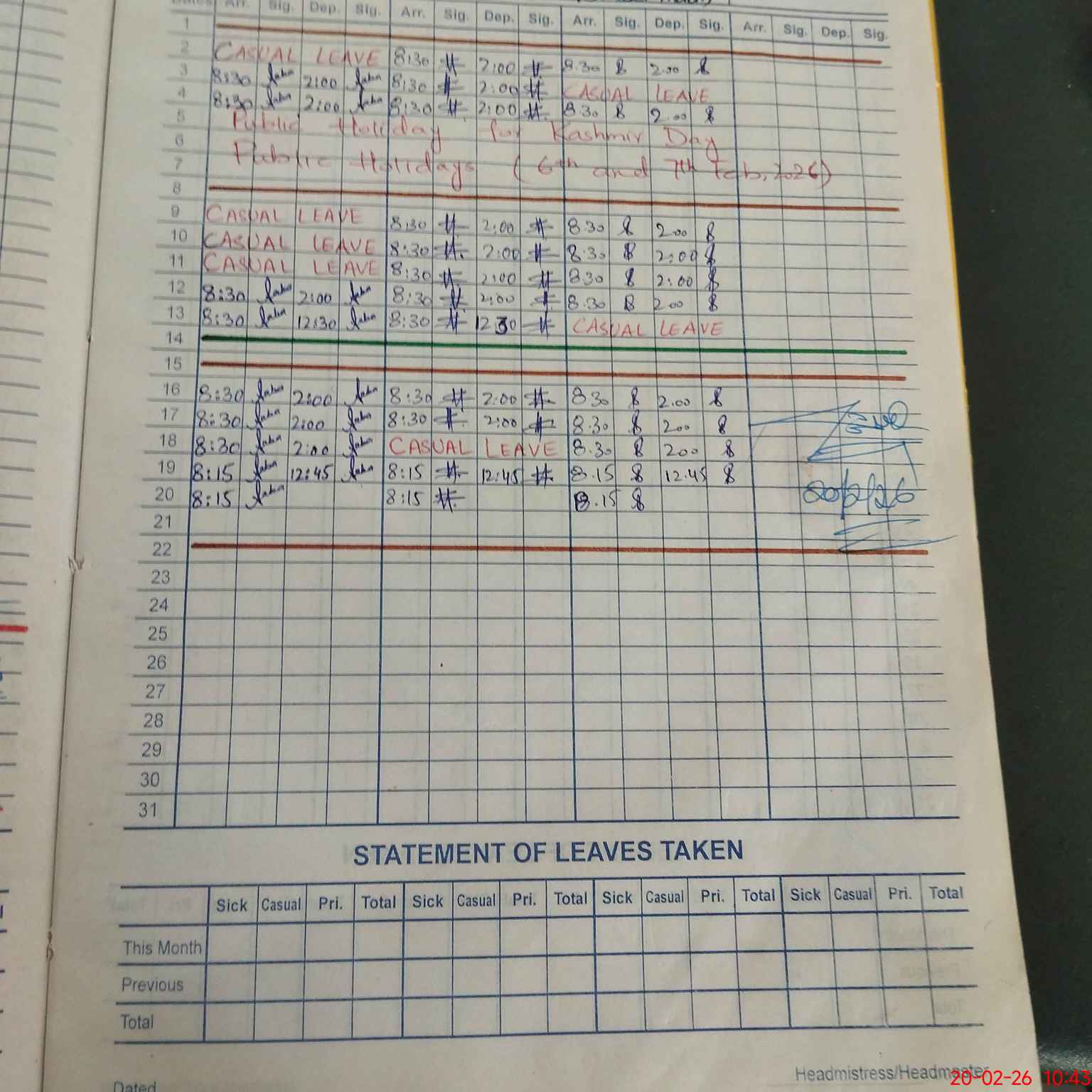 | Leave | Duty | Absent | Maternity | Medical | Ex- Pak |