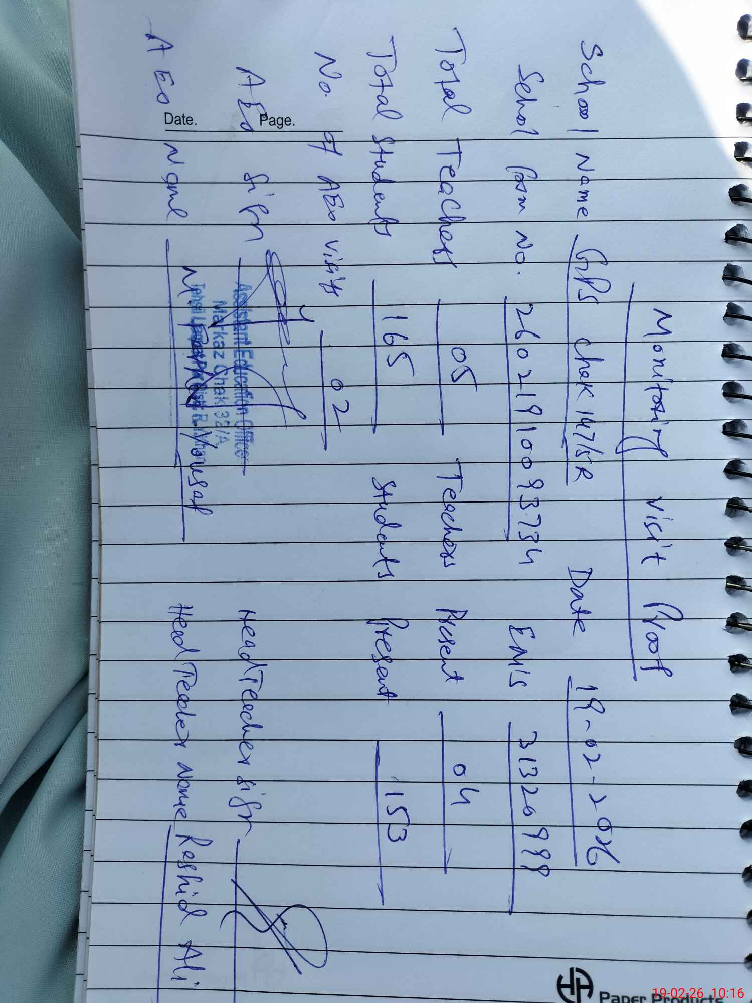 | Certified that this School was Inspected by the Undersigned MEA/DMO Today and the Information Stated Above is as Per Record. | |||||