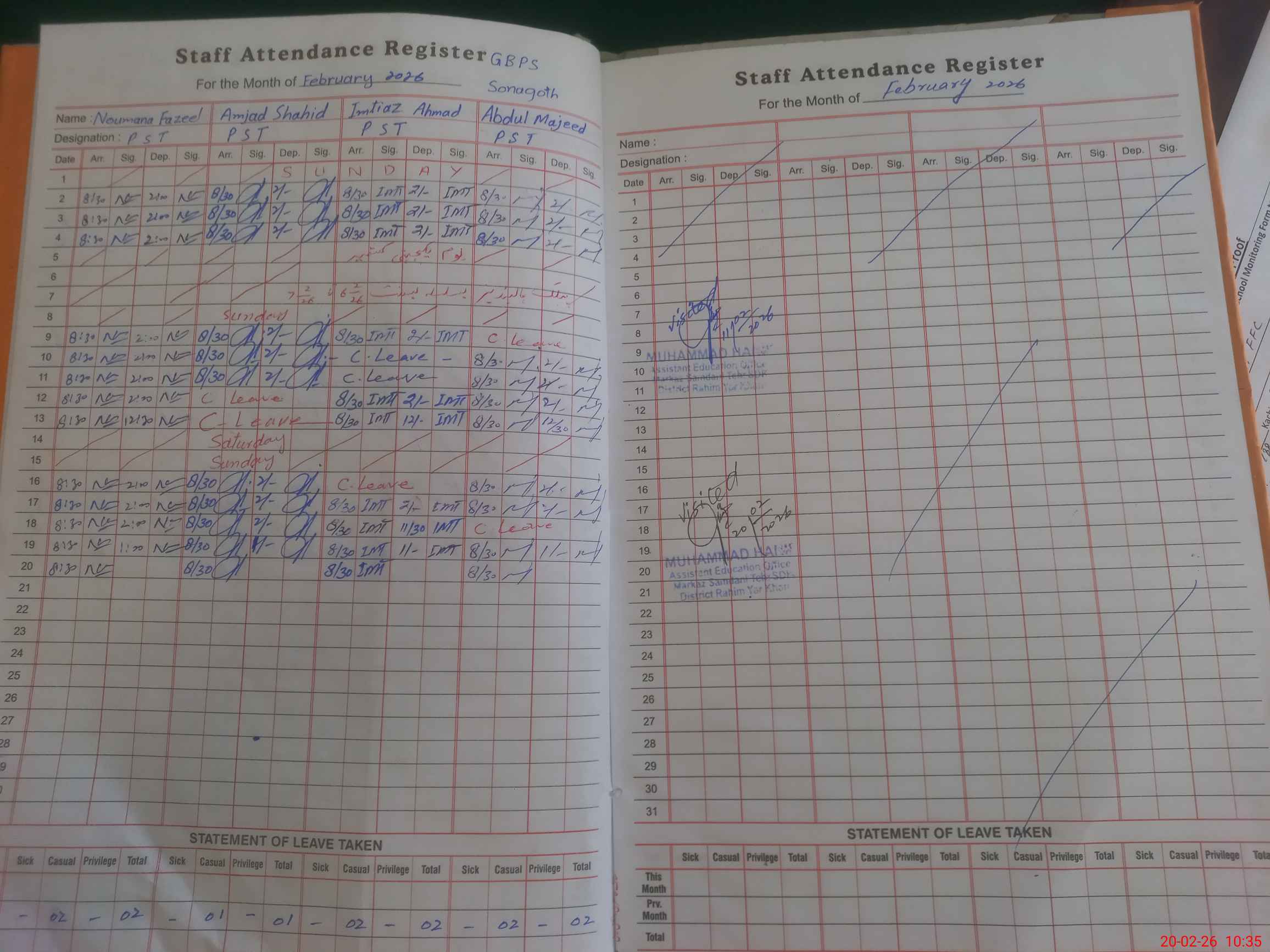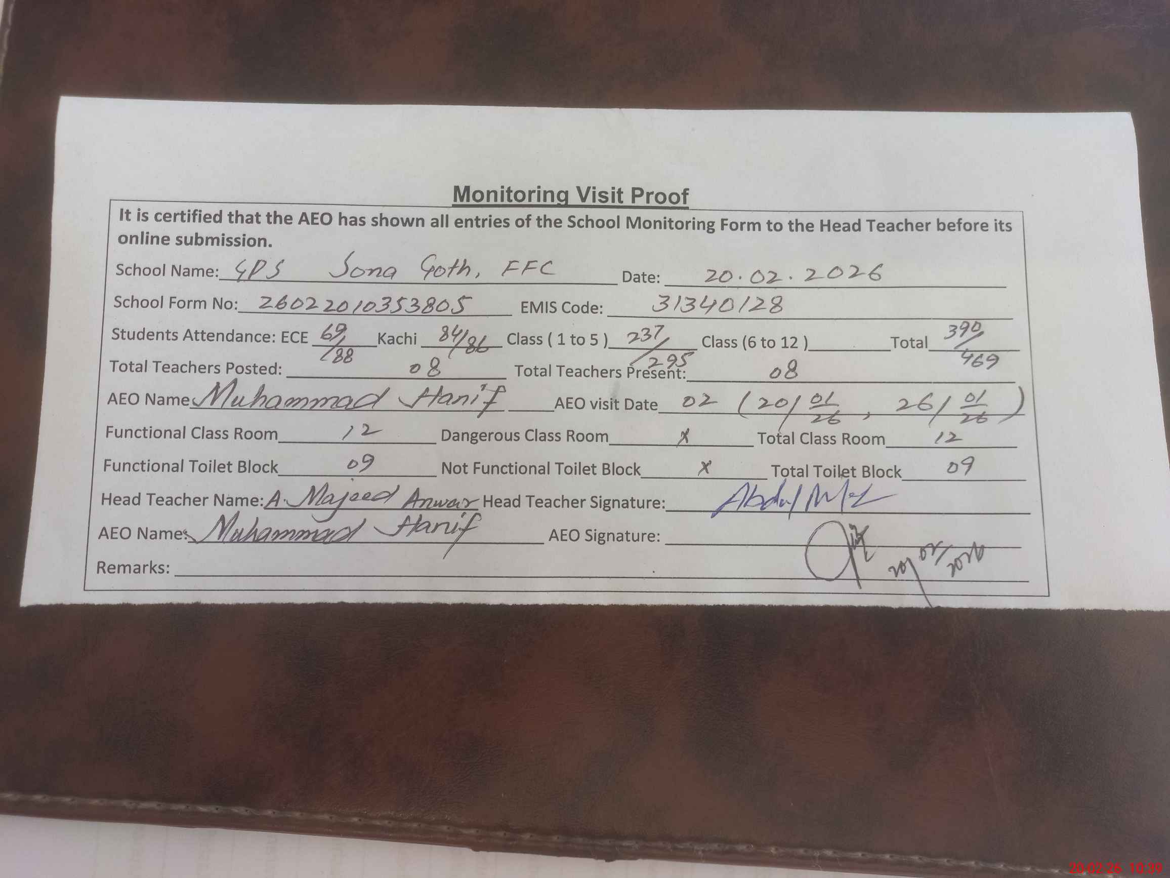 | Attendance Register | Head Teacher | MEA with School | Visit Proof |