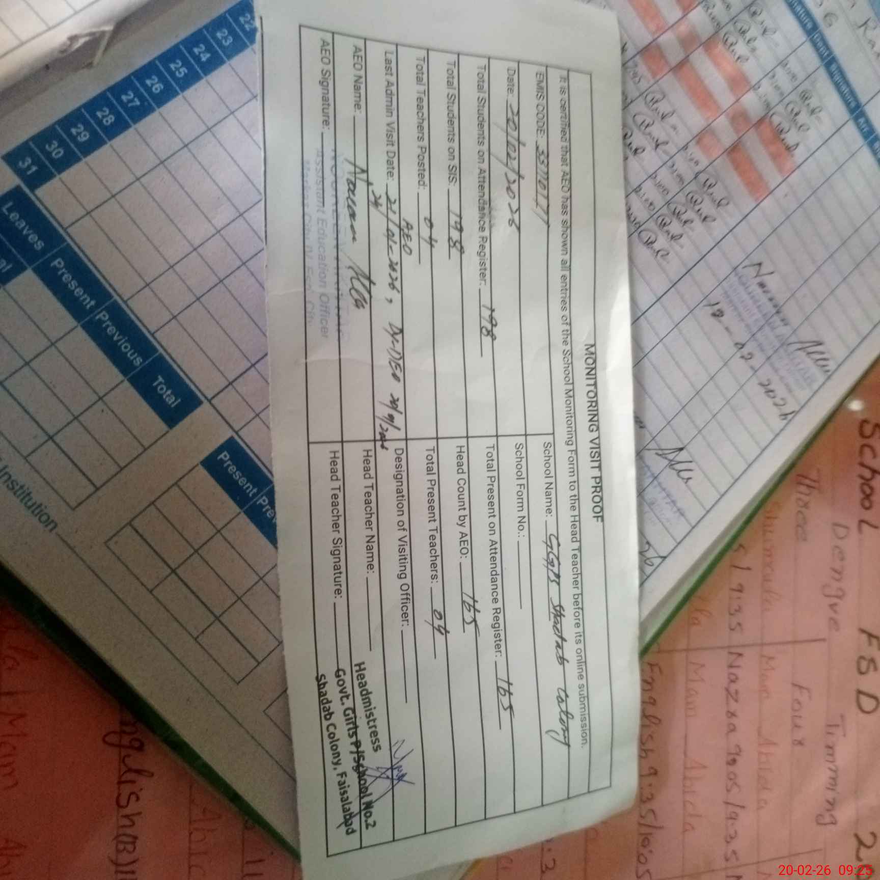 | Attendance Register | Head Teacher | MEA with School | Visit Proof |