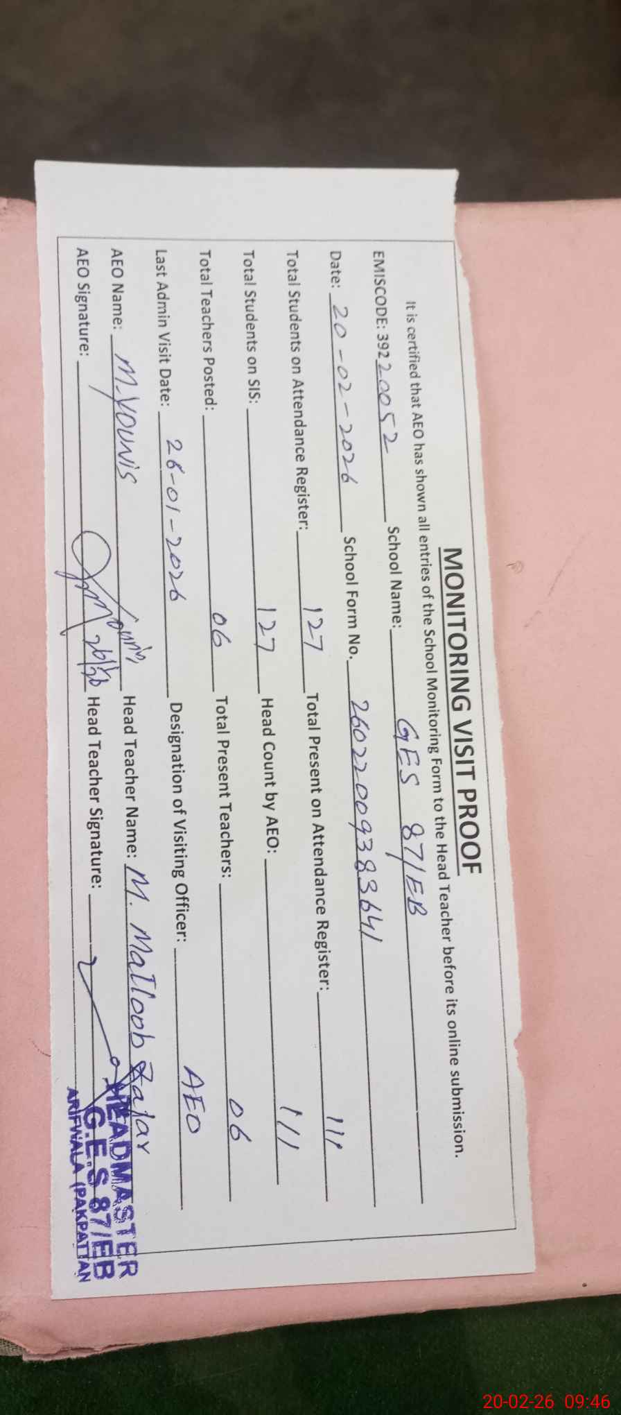 | Attendance Register | Head Teacher | MEA with School | Visit Proof |