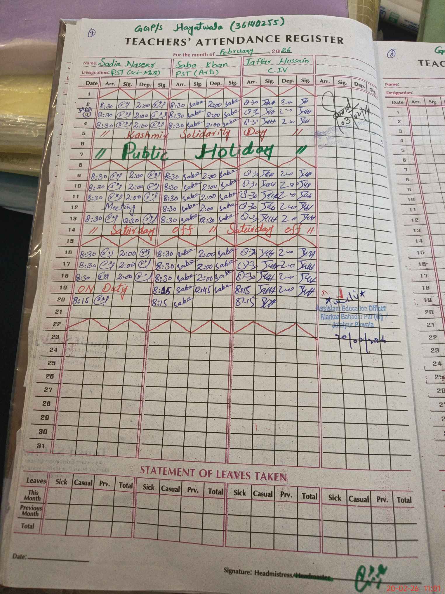 | Attendance Register | Head Teacher | MEA with School | Visit Proof |