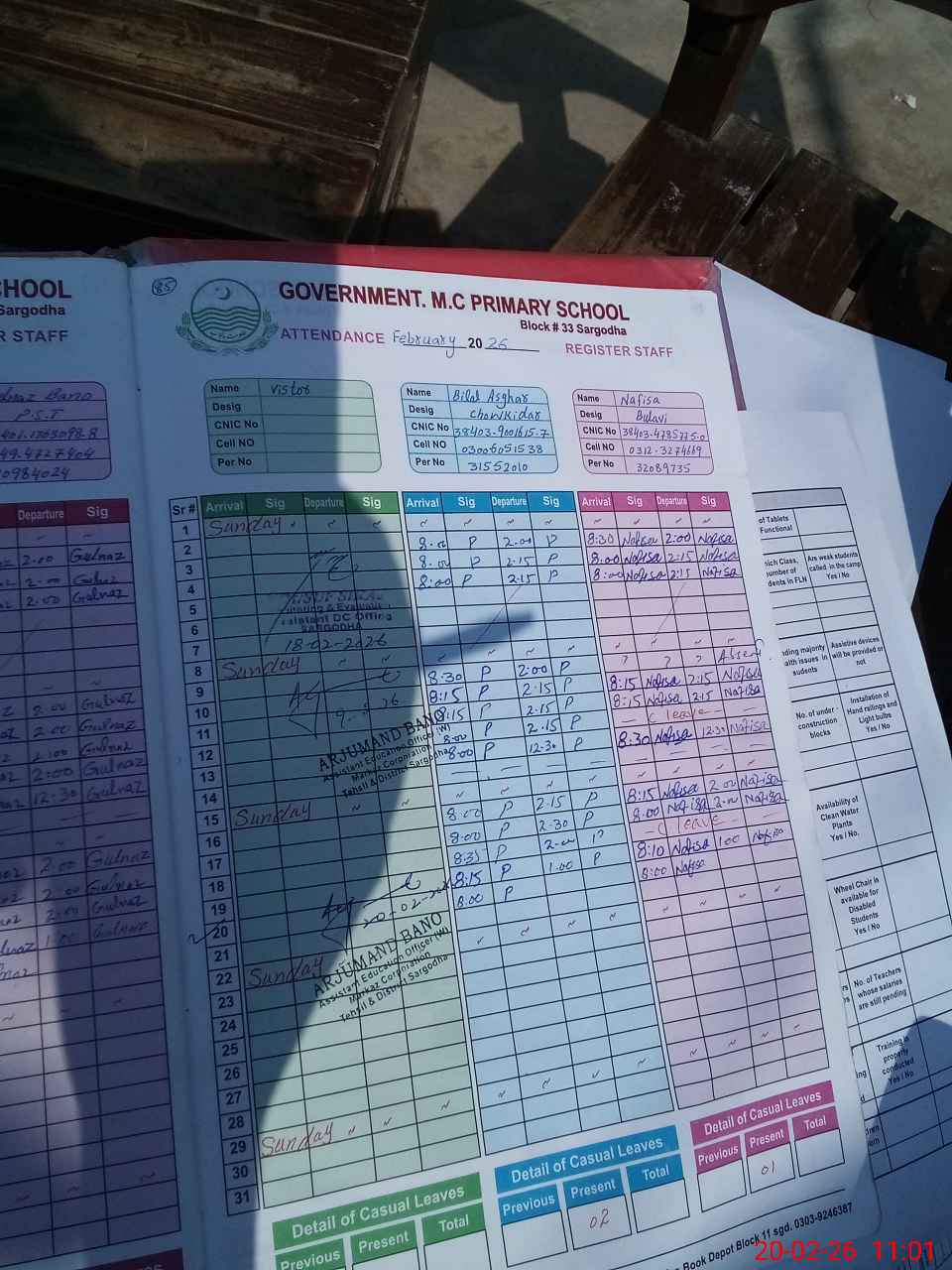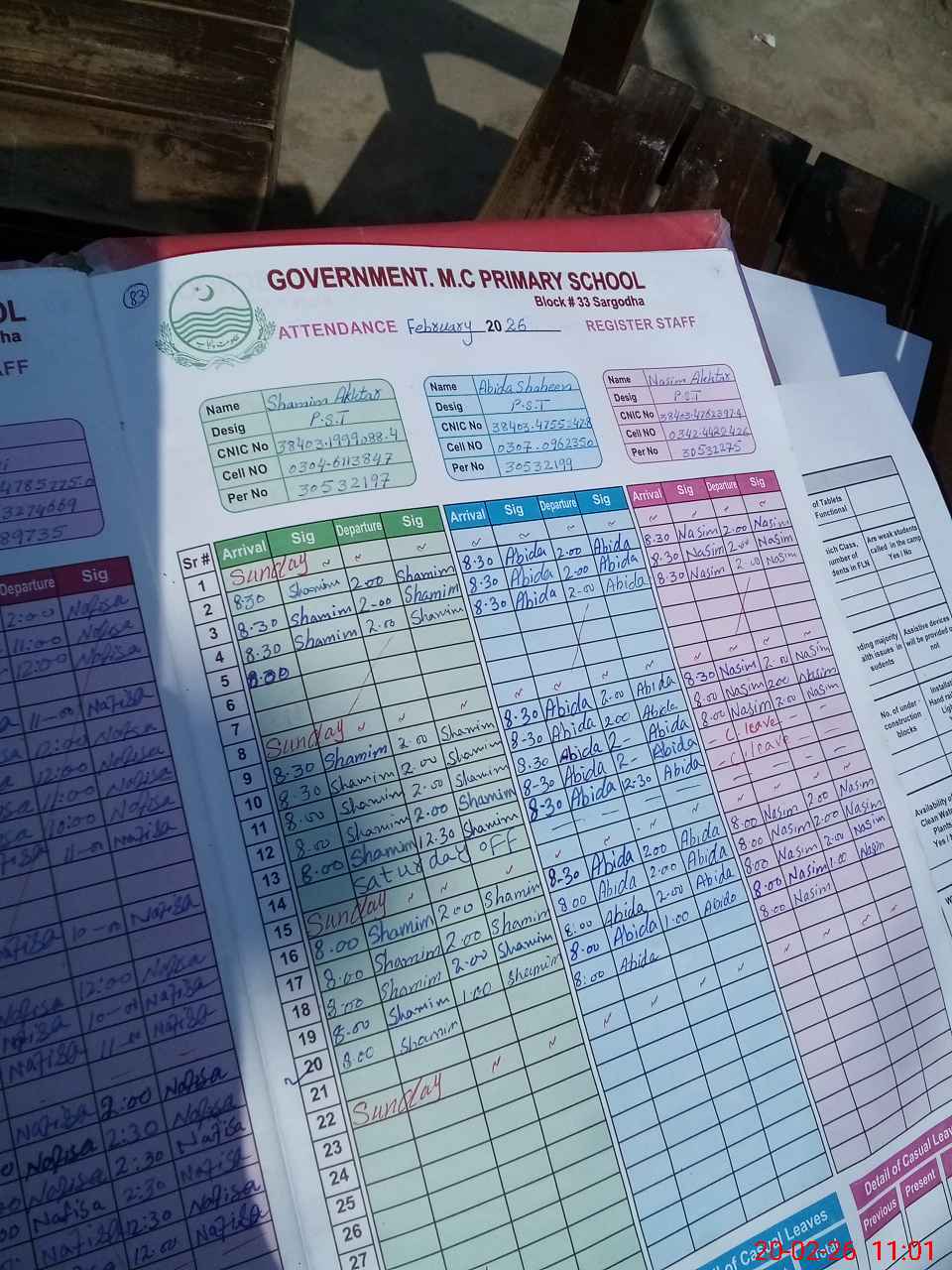 | CNIC | Full Name | Designation | R/C | Absence During Last Calender Month |