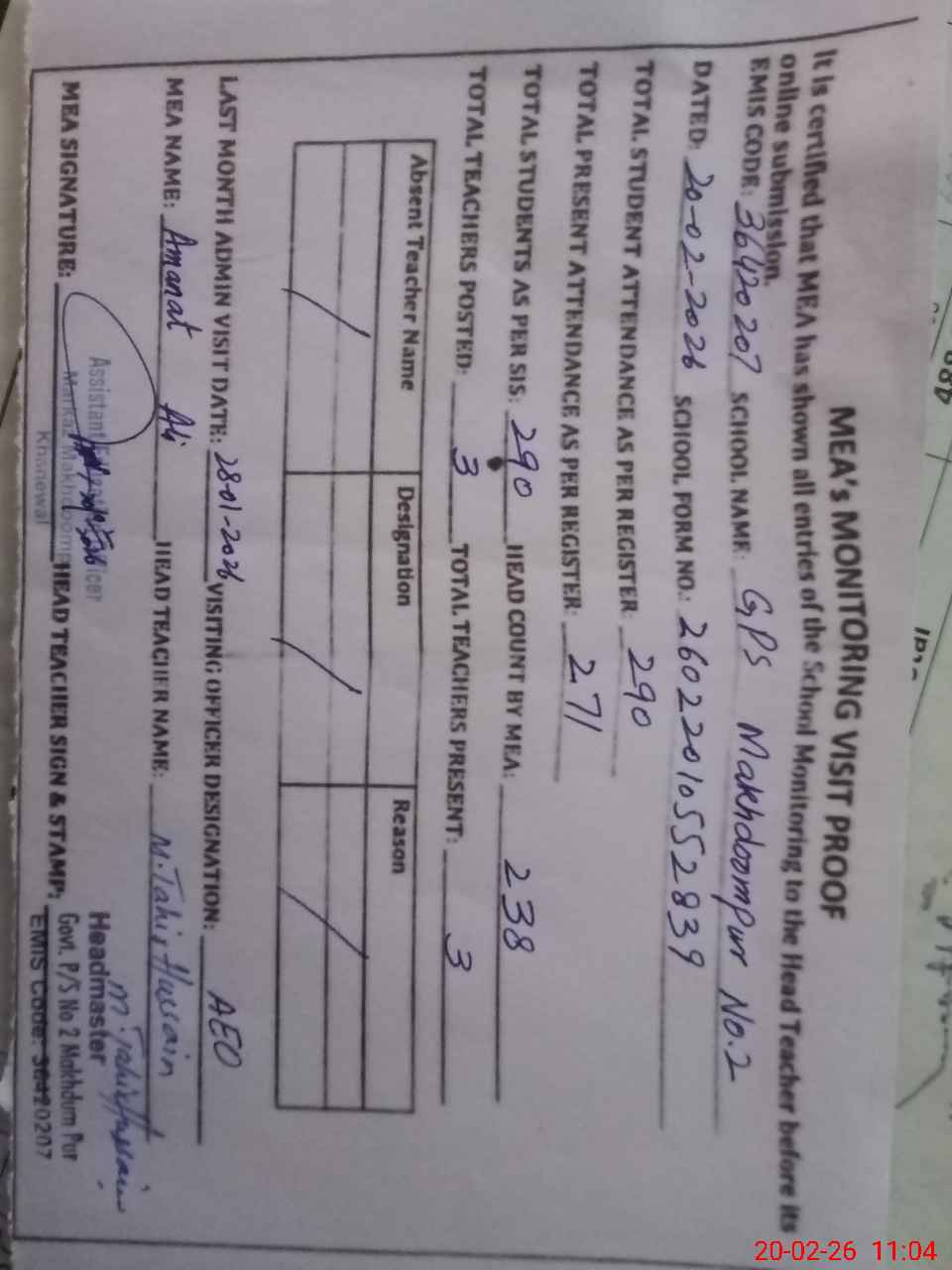 | Attendance Register | Head Teacher | MEA with School | Visit Proof |