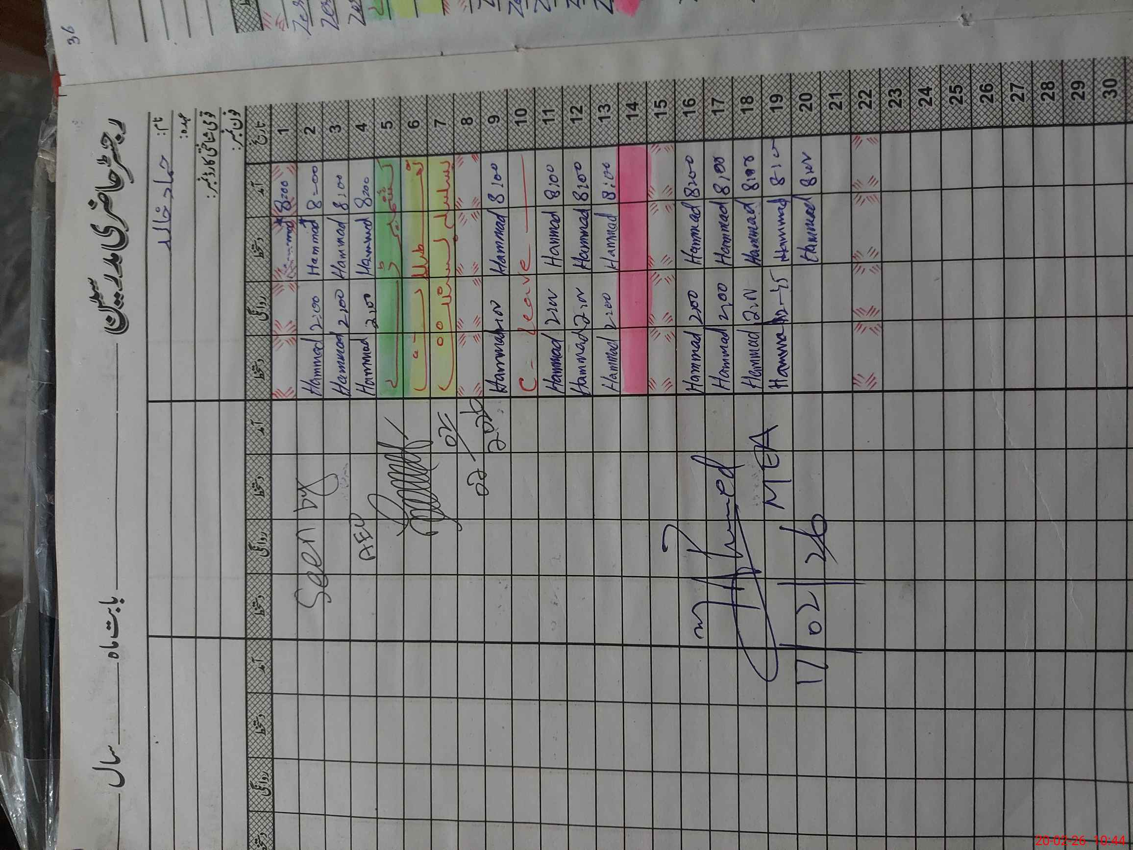 | CNIC | Full Name | Designation | R/C | Absence During Last Calender Month |