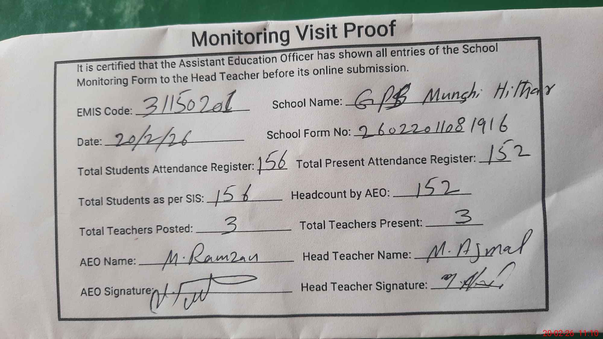 | Attendance Register | Head Teacher | MEA with School | Visit Proof |