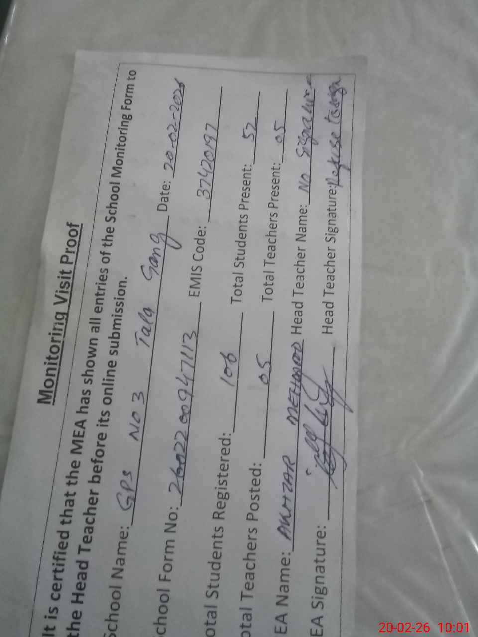 | Attendance Register | Head Teacher | MEA with School | Visit Proof |