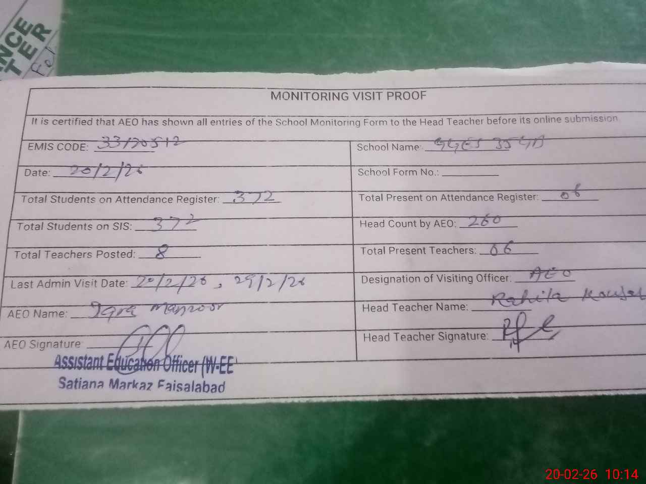 | Certified that this School was Inspected by the Undersigned MEA/DMO Today and the Information Stated Above is as Per Record. | |||||