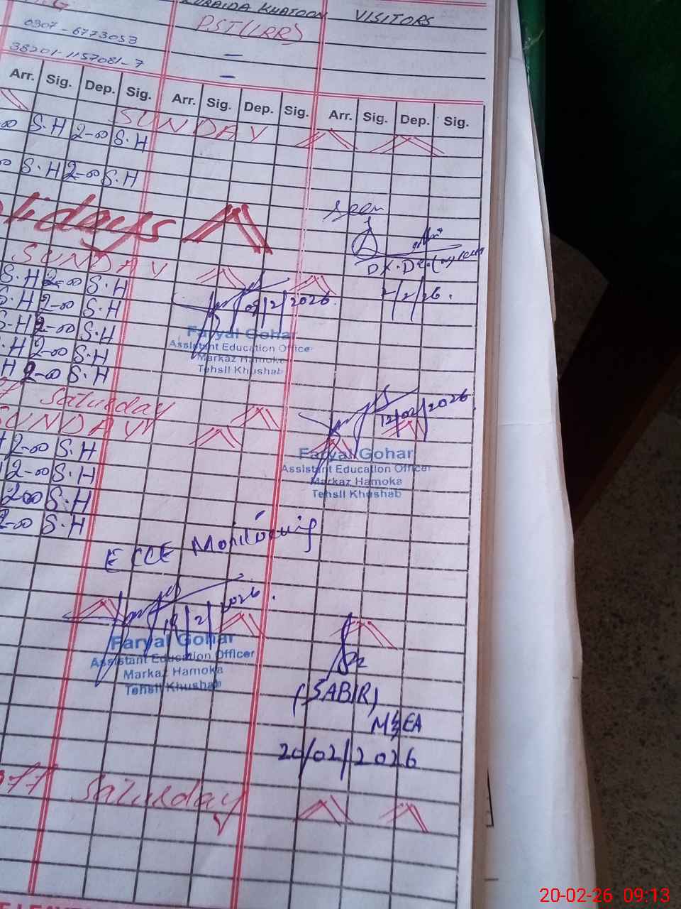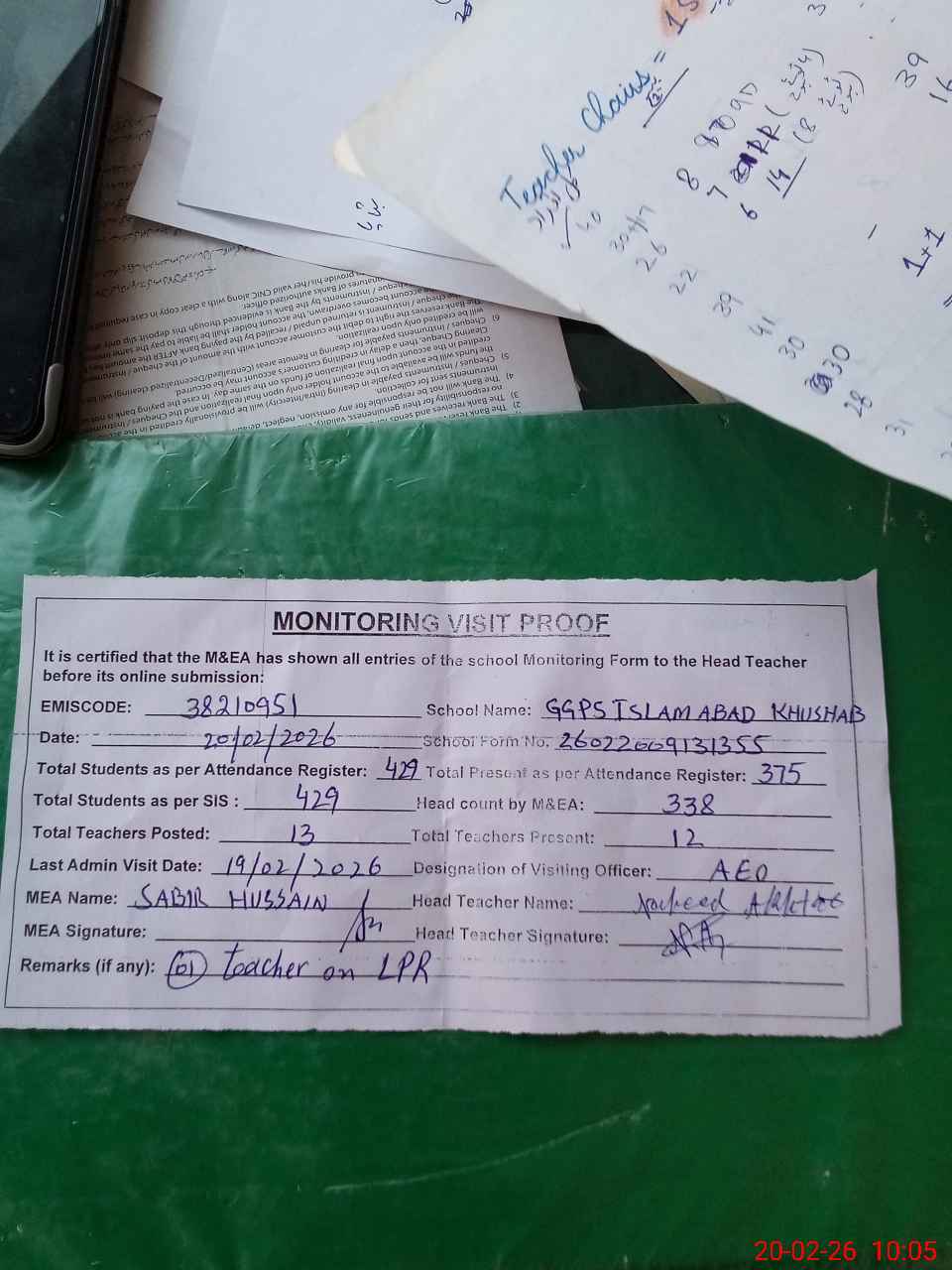 | Remarks (Use Separate Page if Required): no teacher absent total students on register 429 total students on SiS 429 last admin visit by AEO on 19 Feb 2026 | |||||