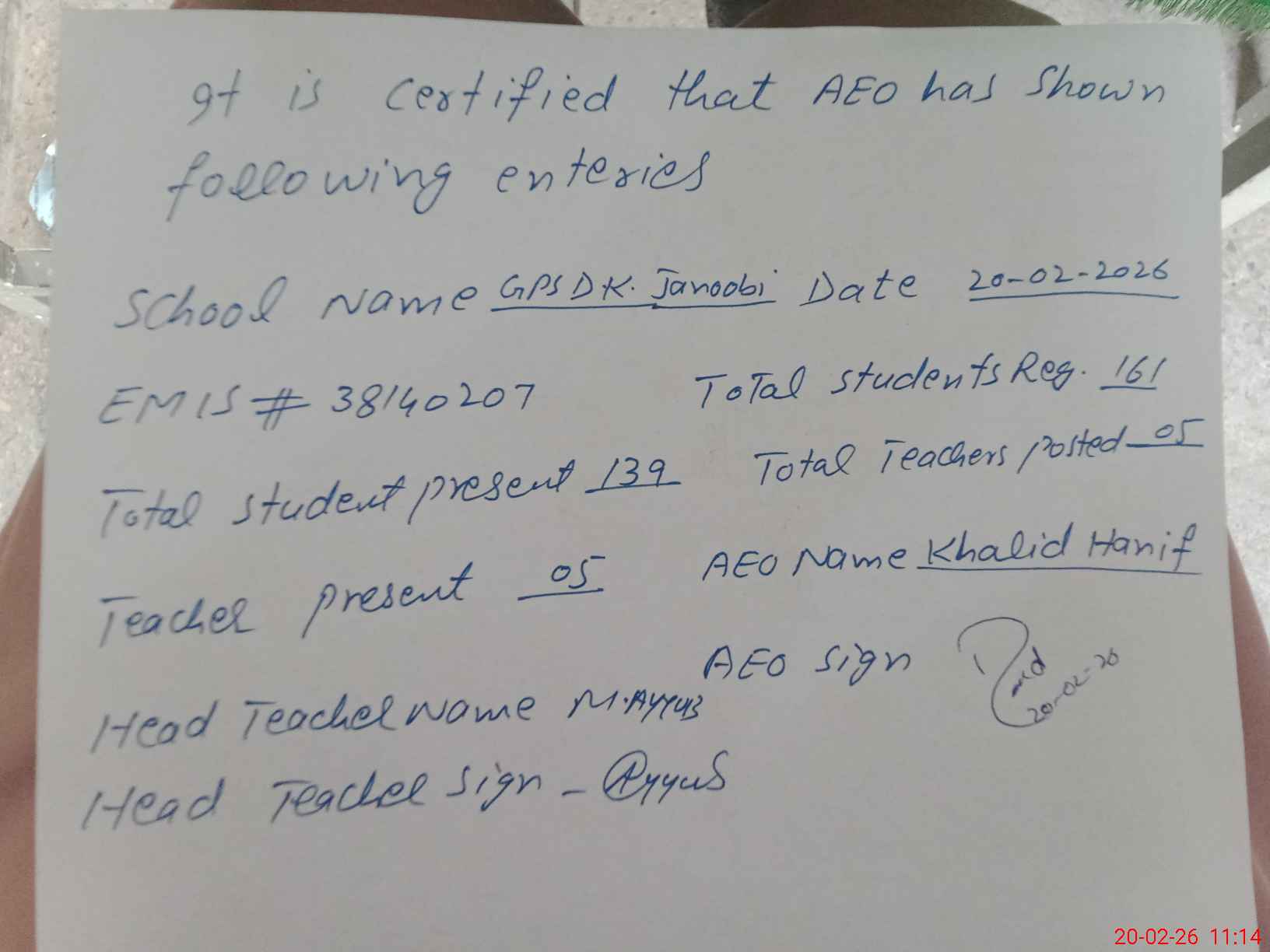 | Certified that this School was Inspected by the Undersigned MEA/DMO Today and the Information Stated Above is as Per Record. | |||||