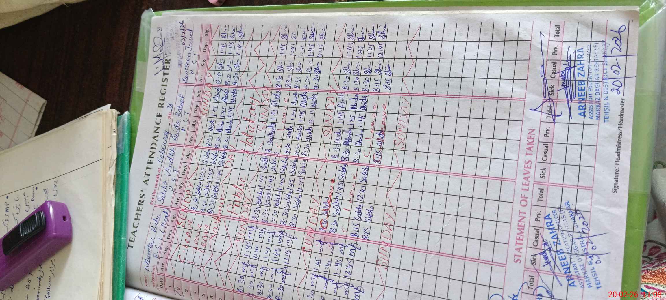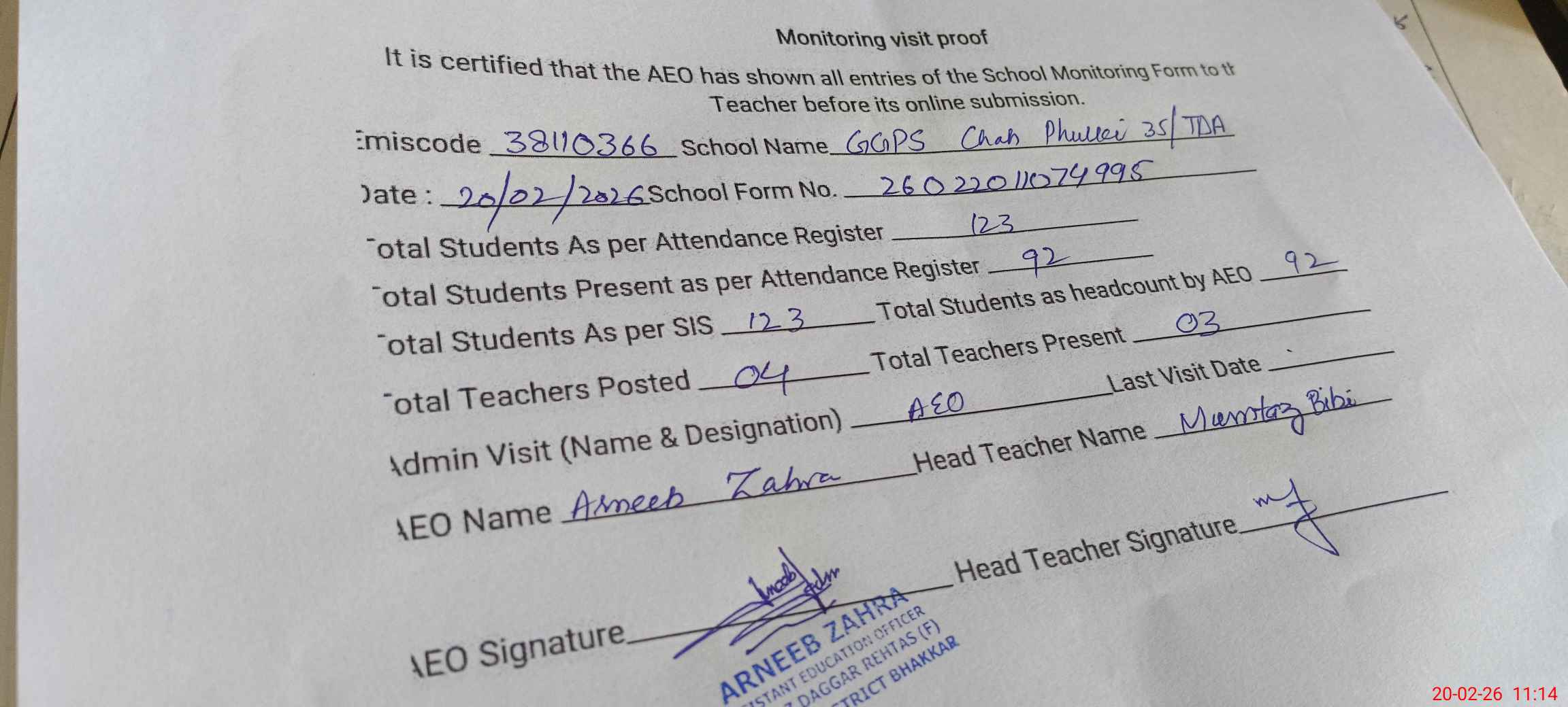 | Attendance Register | Head Teacher | MEA with School | Visit Proof |