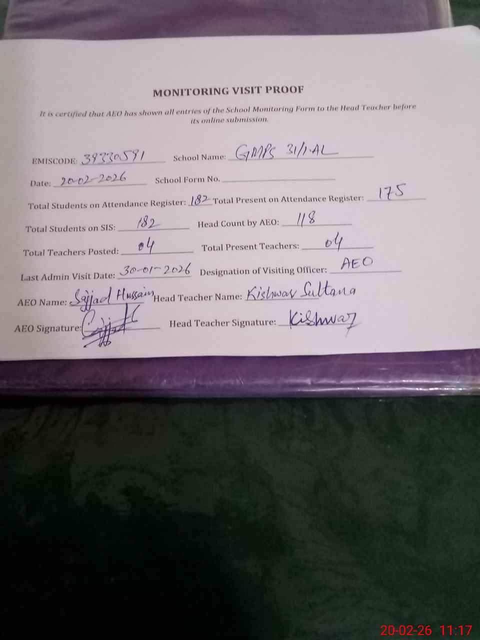 | Attendance Register | Head Teacher | MEA with School | Visit Proof |