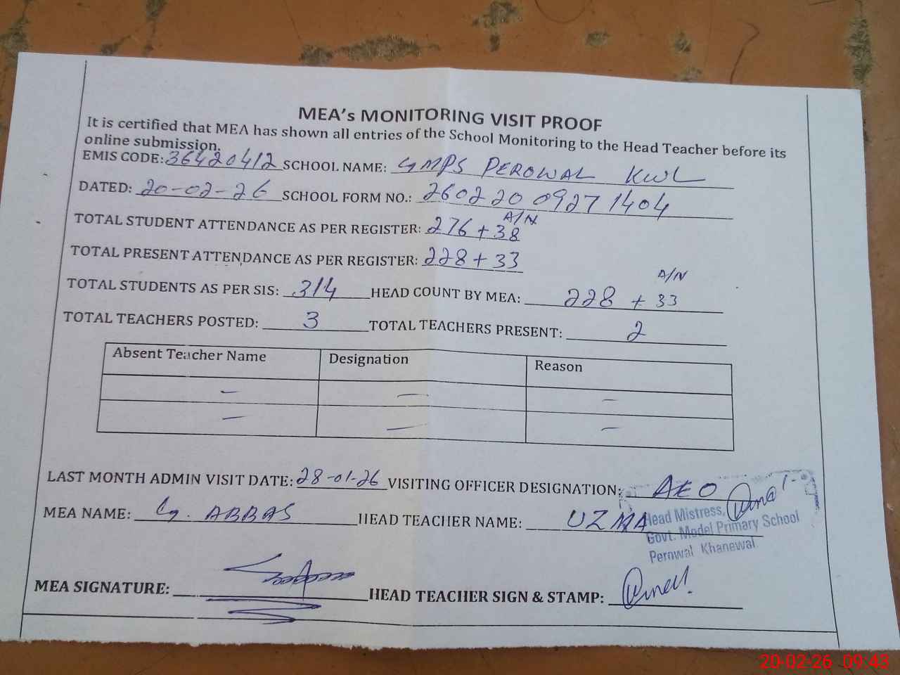 | EMIS Code: 36420412 | Name of School: GPS MODEL PEROWAL, KHANEWAL | |||