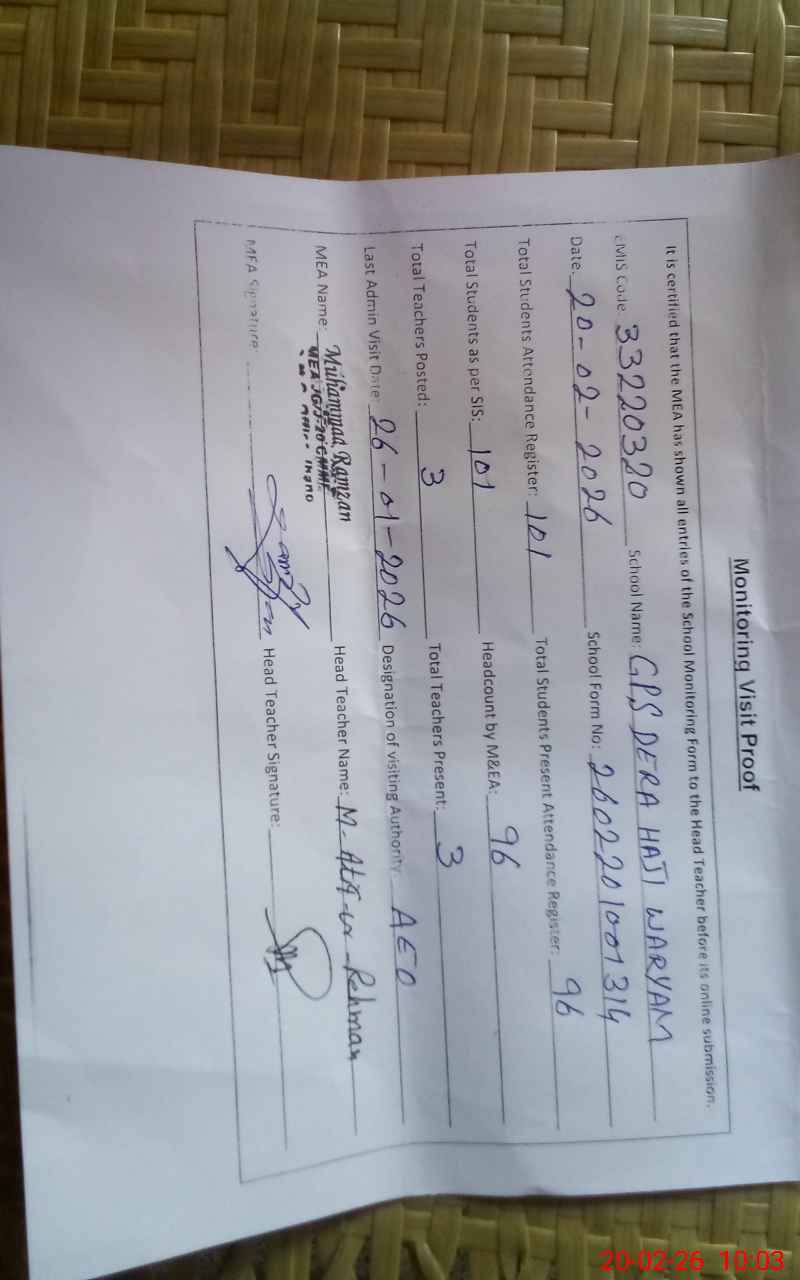 | EMIS Code: 33220320 | Name of School: GPS DERA HAJI WARYAM | |||