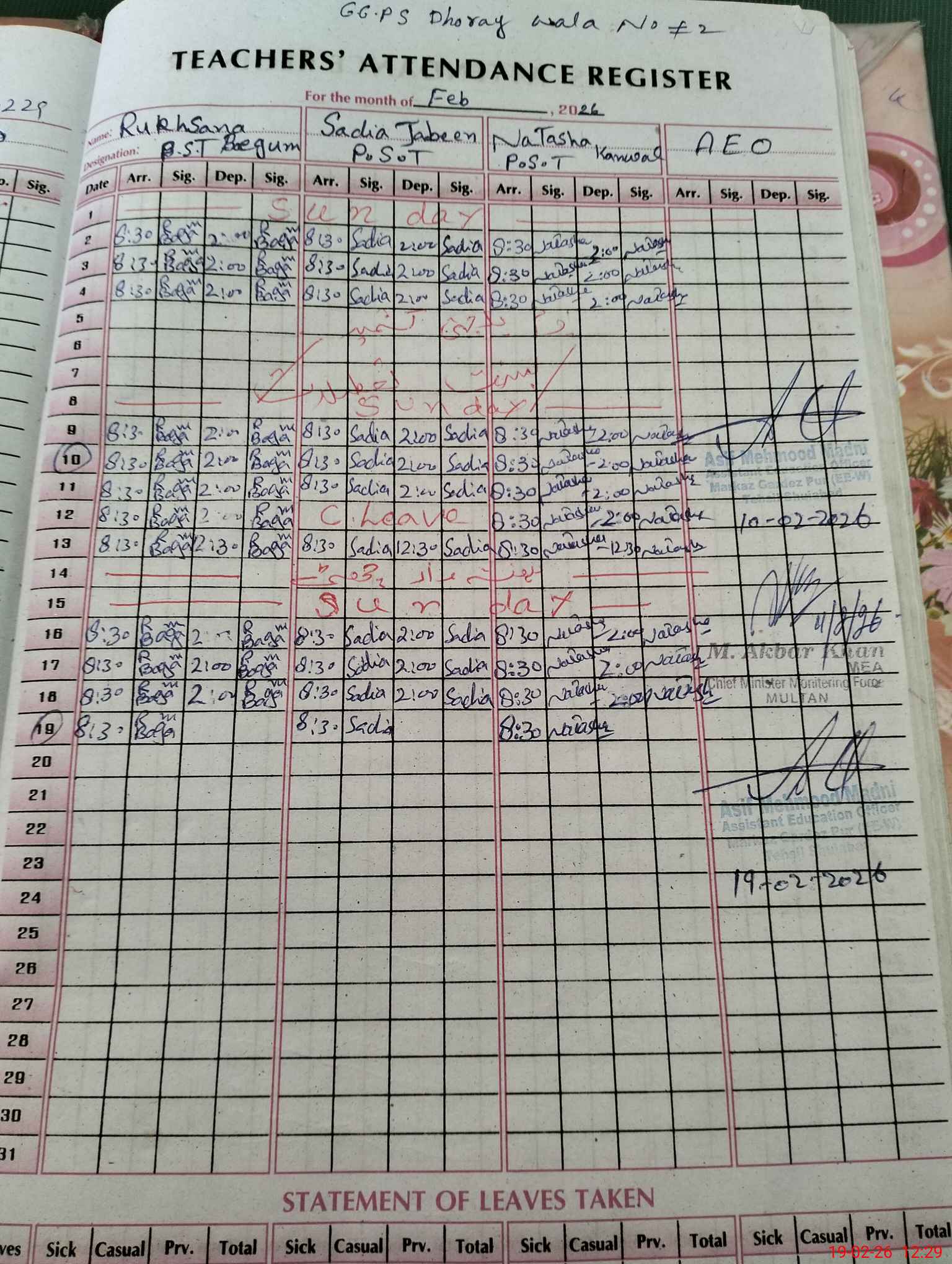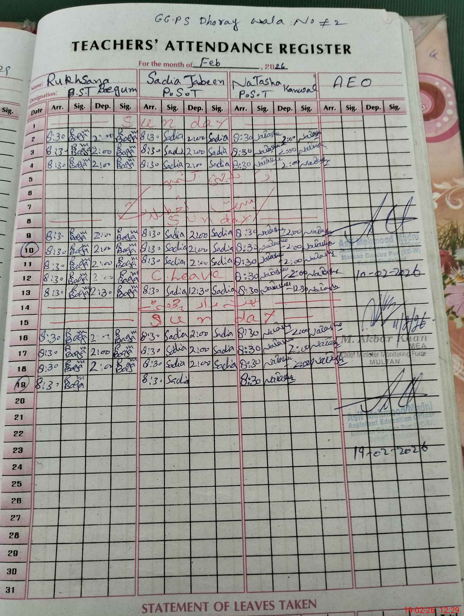 | Attendance Register | Head Teacher | MEA with School | Visit Proof |