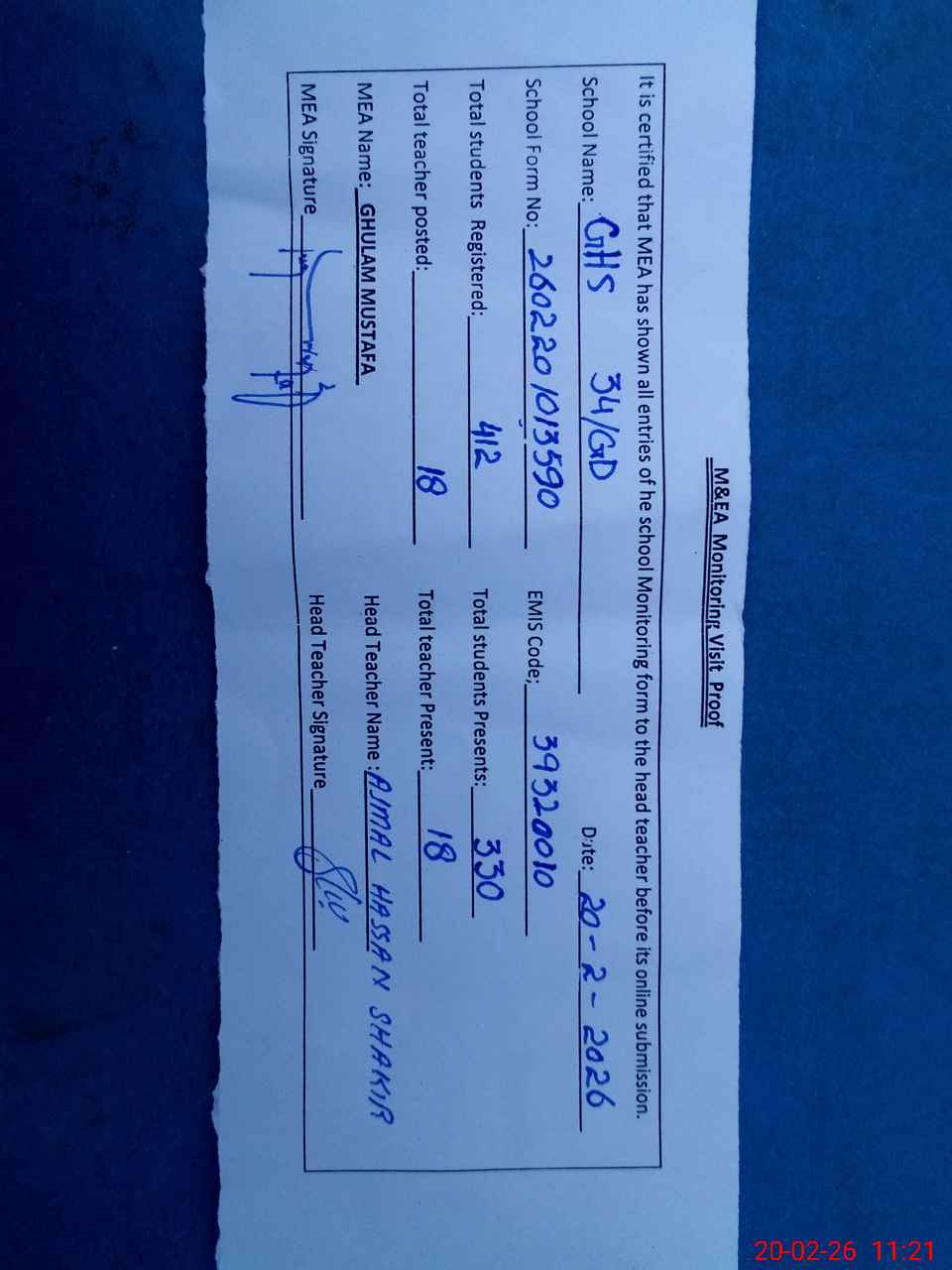 | Attendance Register | Head Teacher | MEA with School | Visit Proof |