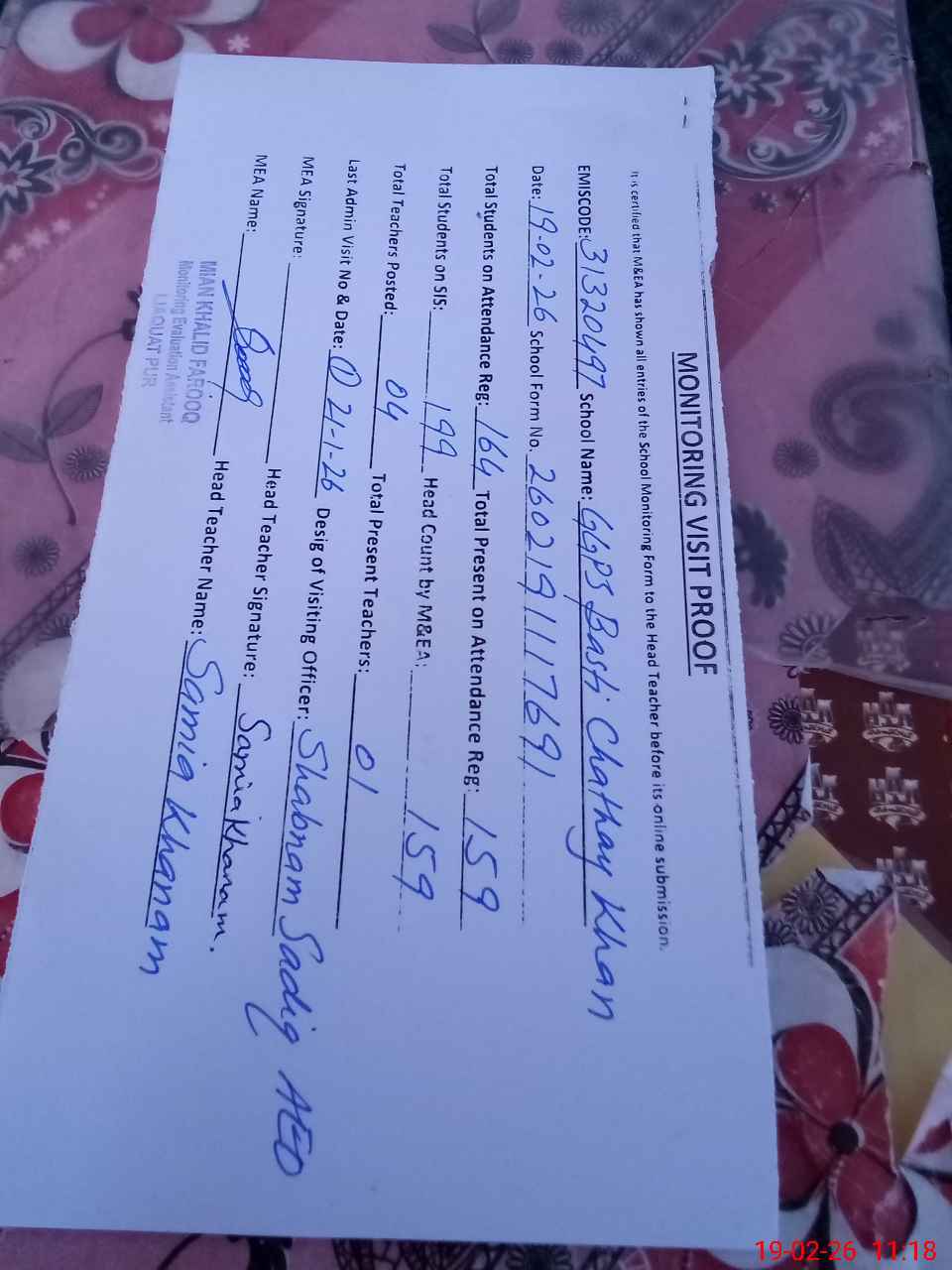 | Monitoring Date: 19-02-2026 | Start Time: 19-02-2026 10:55 AM | End Time: 19-02-2026 11:30 AM | Name of MEA: Kh**** Fa**** | |
