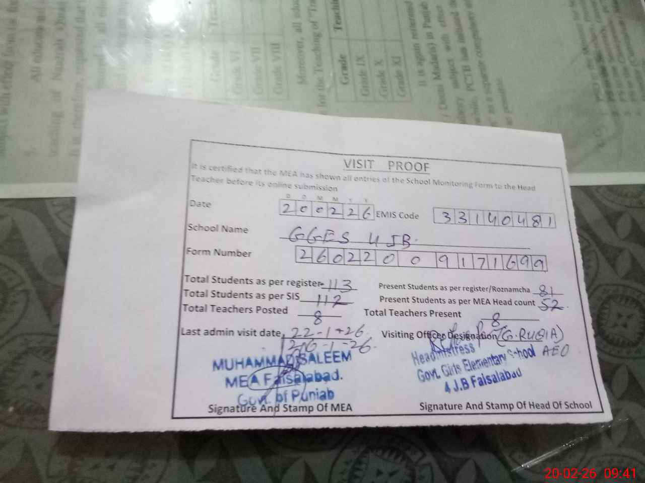| Attendance Register | Head Teacher | MEA with School | Visit Proof |