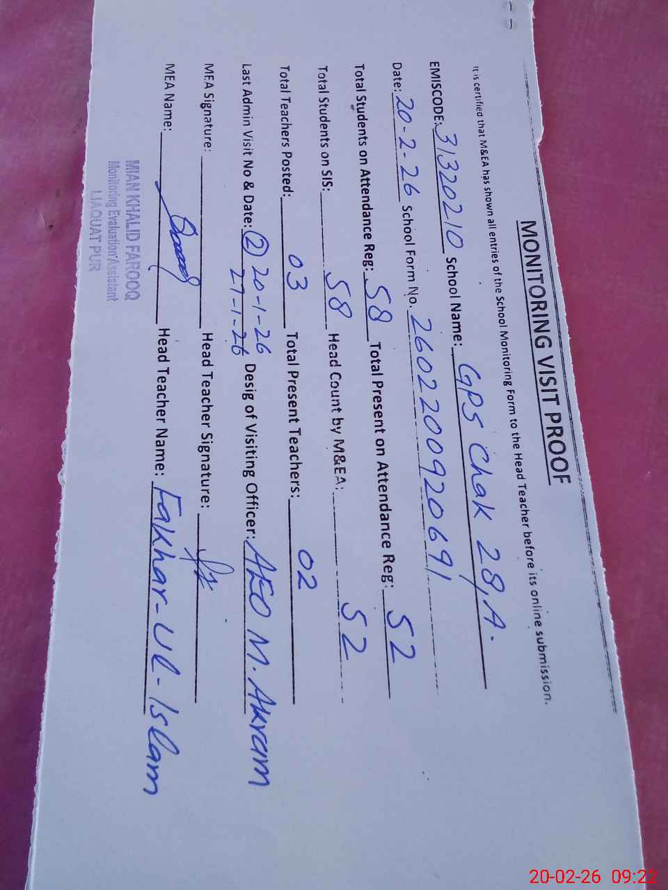 | Attendance Register | Head Teacher | MEA with School | Visit Proof |