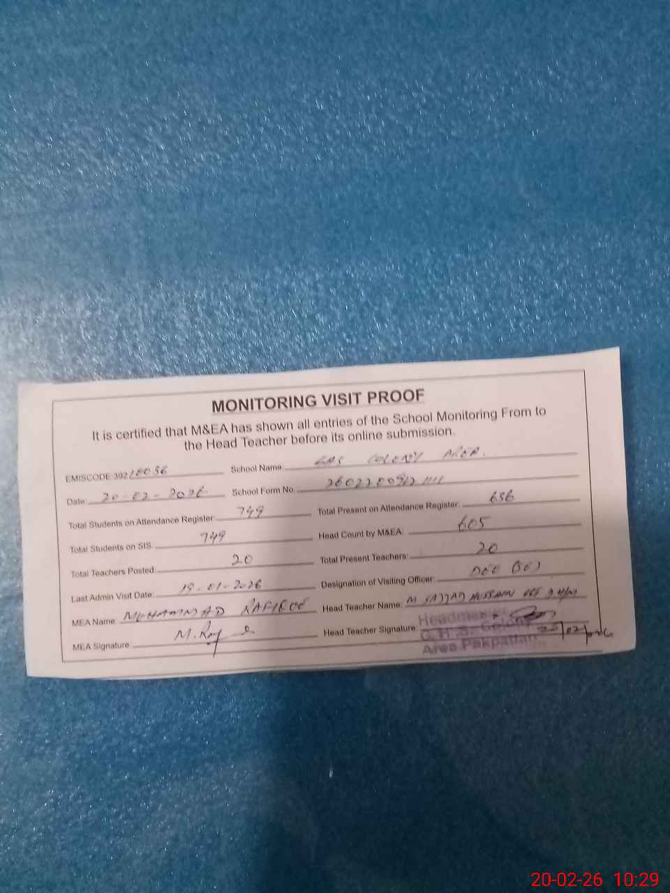 | EMIS Code: 39210036 | Name of School: GHS COLONY AREA PAKPATTAN | |||