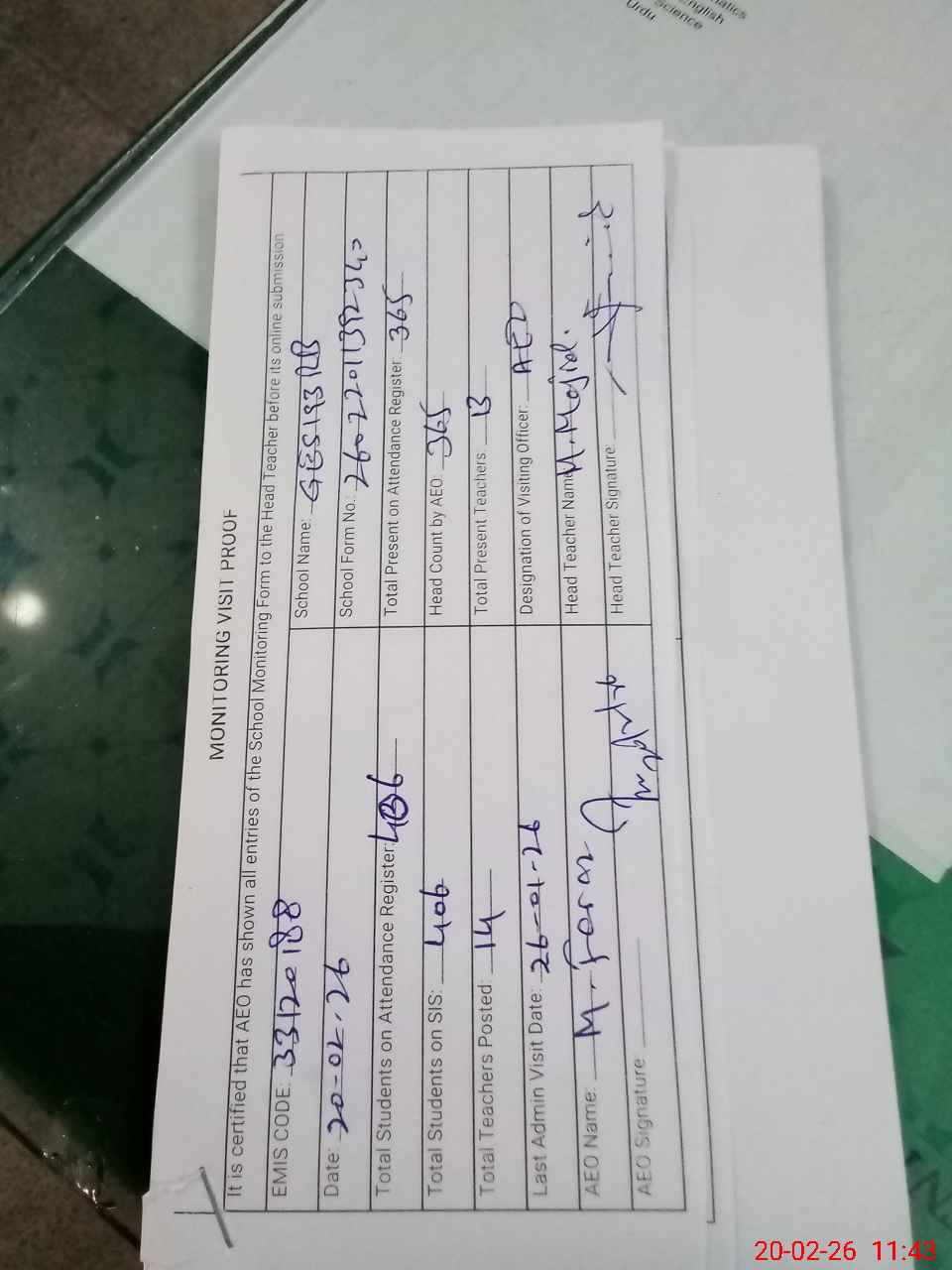 | Attendance Register | Head Teacher | MEA with School | Visit Proof |