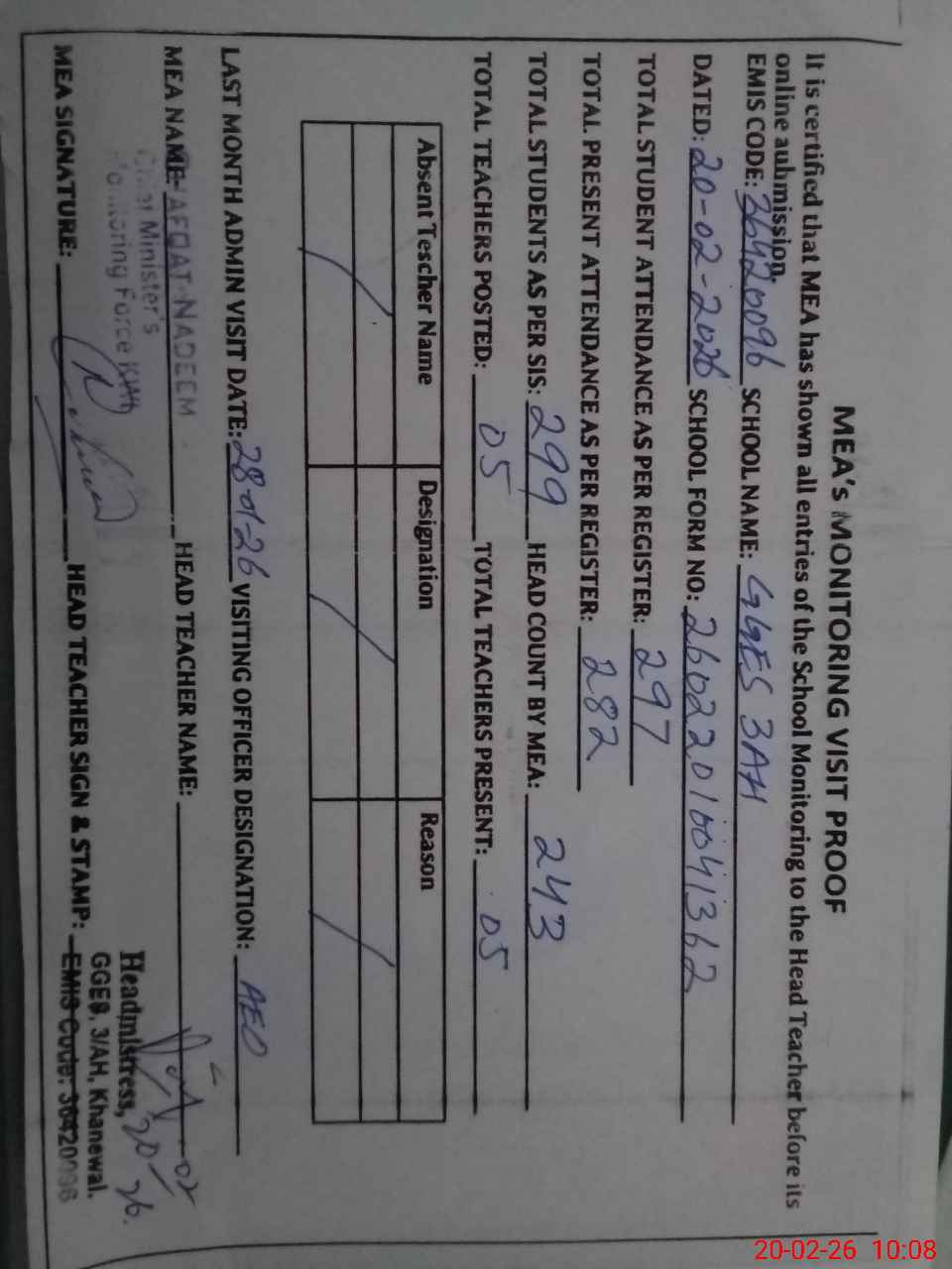 | Attendance Register | Head Teacher | MEA with School | Visit Proof |
