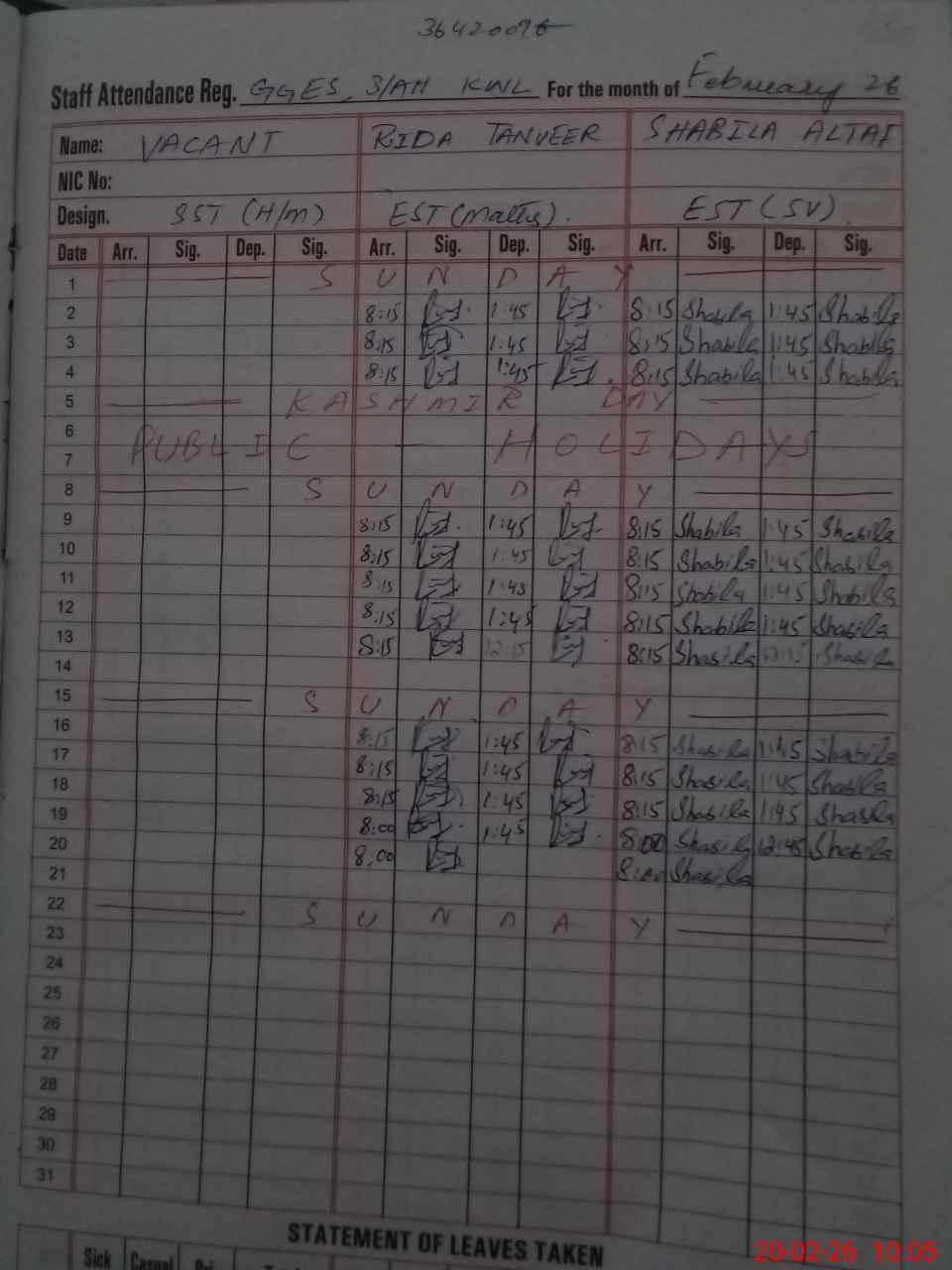 | CNIC | Full Name | Designation | R/C | Absence During Last Calender Month |
