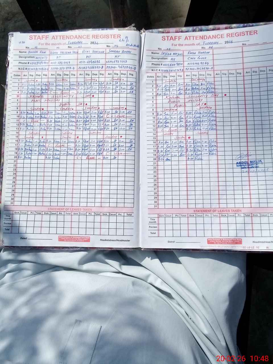| CNIC | Full Name | Designation | R/C | Absence During Last Calender Month |
