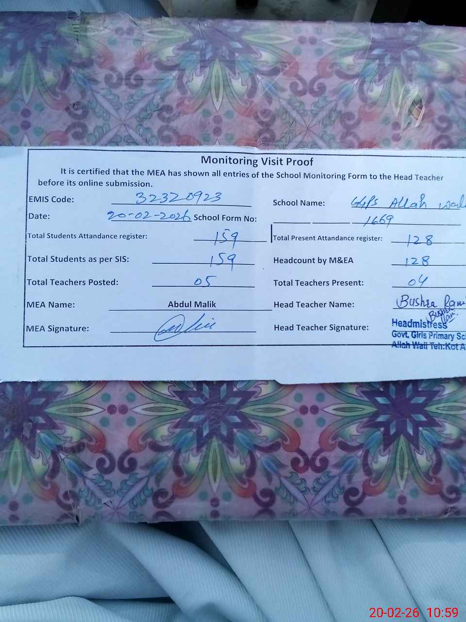 | EMIS Code: 32320923 | Name of School: GGPS ALLAH WALI | |||