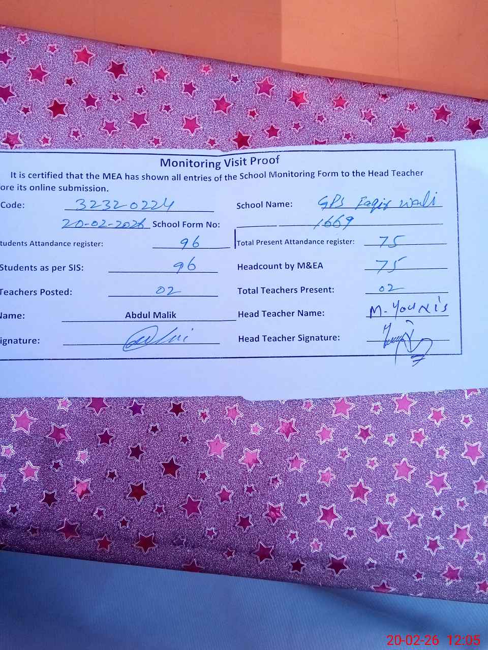 | EMIS Code: 32320224 | Name of School: GPS FAQIR WALI | |||