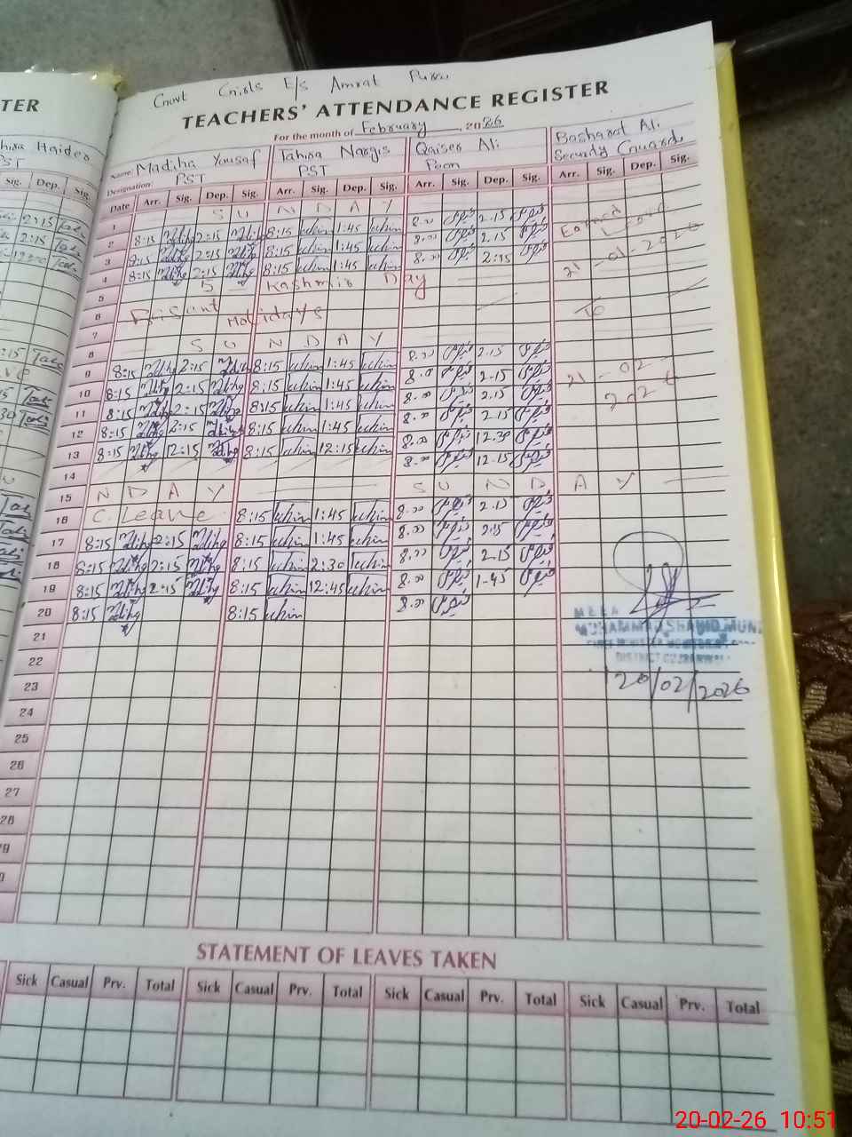 | Monitoring Date: 20-02-2026 | Start Time: 20-02-2026 10:01 AM | End Time: 20-02-2026 10:52 AM | Name of MEA: S-**** Sh**** Mu**** | |