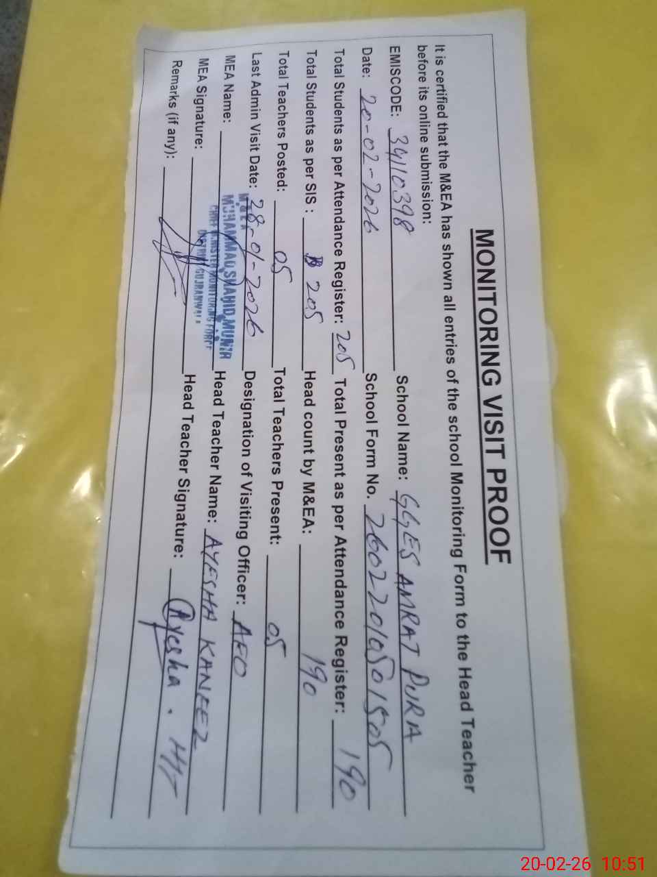 | Attendance Register | Head Teacher | MEA with School | Visit Proof |