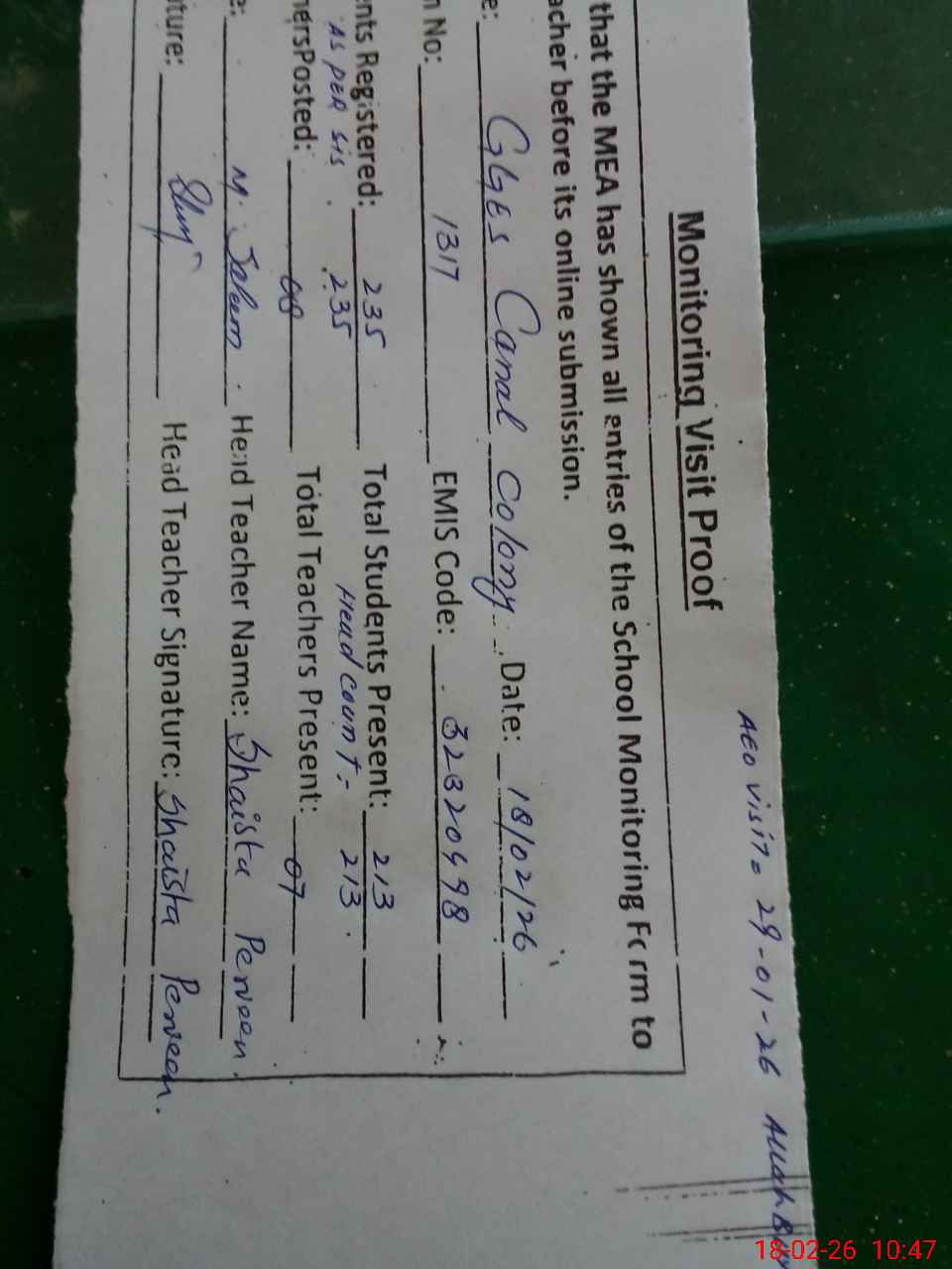 | Attendance Register | Head Teacher | MEA with School | Visit Proof |
