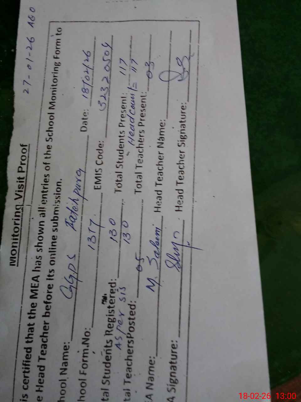 | Attendance Register | Head Teacher | MEA with School | Visit Proof |