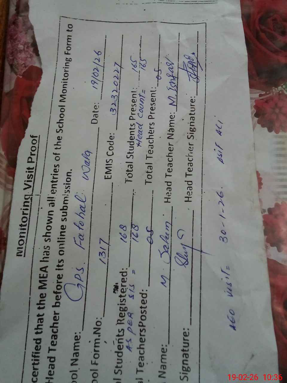 | Attendance Register | Head Teacher | MEA with School | Visit Proof |