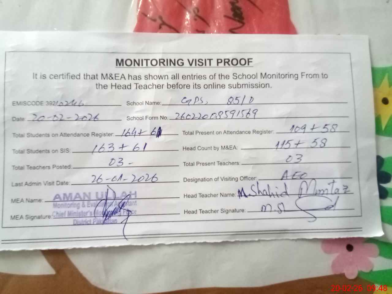 | Attendance Register | Head Teacher | MEA with School | Visit Proof |